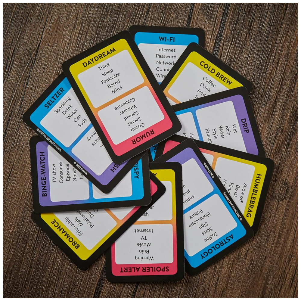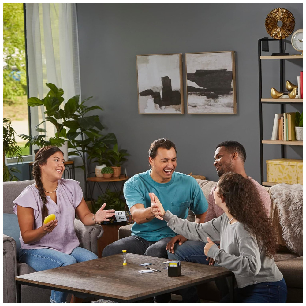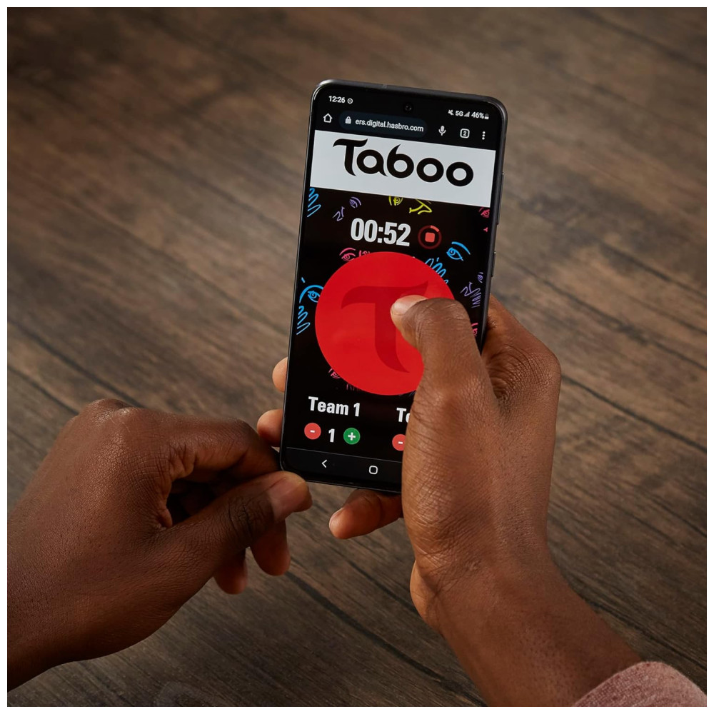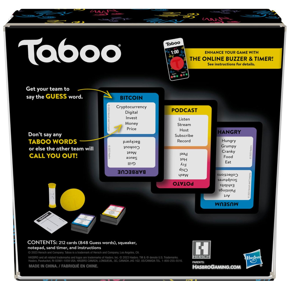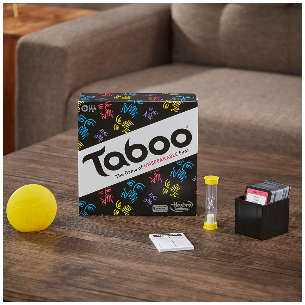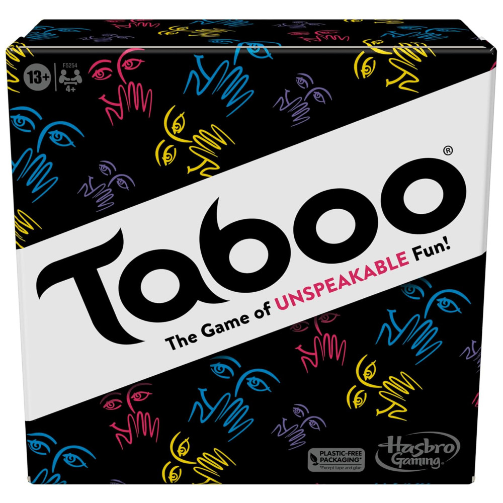 Taboo é um clássico jogo de tabuleiro que conta com 212 cartas contendo 848 palavras relacionadas à cultura pop, tendências e muito mais. O objetivo do jogo é fazer com que sua equipe adivinhe a palavra chave sem mencionar nenhuma das palavras Taboo listadas na carta. Os jogadores devem dar pistas criativas e bem pensadas para ajudar os membros da equipe a adivinhar as palavras rapidamente, enquanto competem contra o cronômetro.