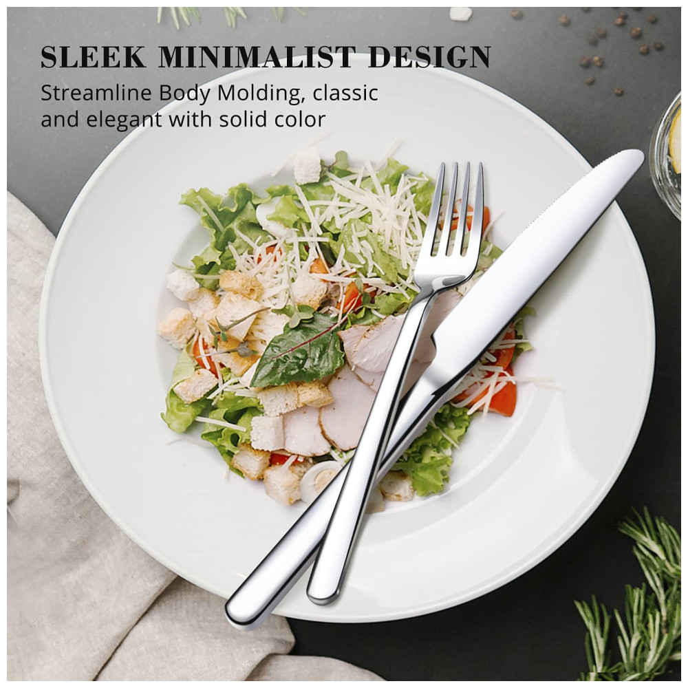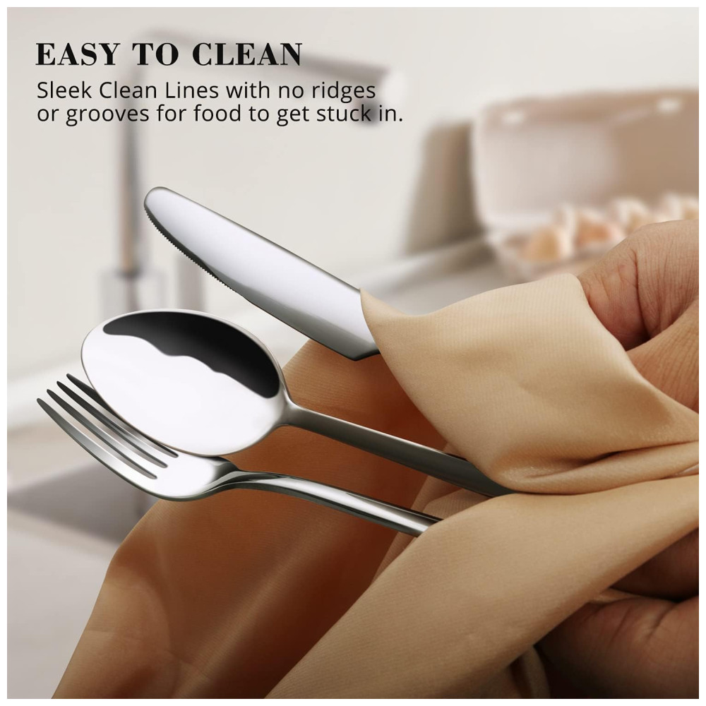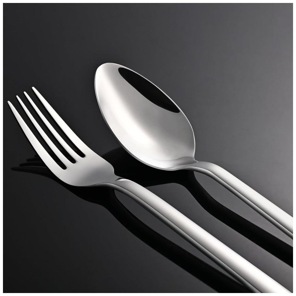 O Conjunto de Talheres KINGSTONE inclui 20 peças para 4 pessoas: 4 facas de jantar (22,6 cm – 80g), 4 garfos de jantar (20,8 cm – 46g), 4 colheres de jantar (20,5 cm – 55g), 4 garfos de salada (17 cm – 35g) e 4 colheres de chá (17 cm – 36g). Com múltiplas polimentos, o conjunto tem um acabamento espelhado elegante, sem bordas ásperas. Feito de aço inoxidável 18/10 de alta qualidade, é resistente à corrosão e possui cabos espessados ergonômicos. Pode ser lavado na lava-louças, porém a lavagem à mão é recomendada para evitar impressões digitais. Este conjunto brilhante é perfeito para diversas ocasiões e elevará suas refeições diárias para uma experiência de jantar refinada.