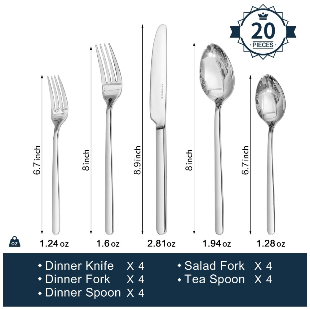 Jogo de Talheres KINGSTONE 20 Peças em Inox 18/10 p/ 4 Pessoas – Acabamento Brilhante – Resistente à Ferrugem – Pode ir na Máquina – Perfeito para Casa