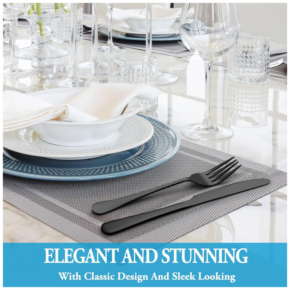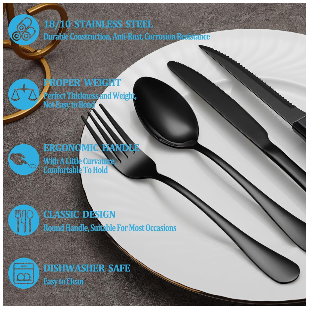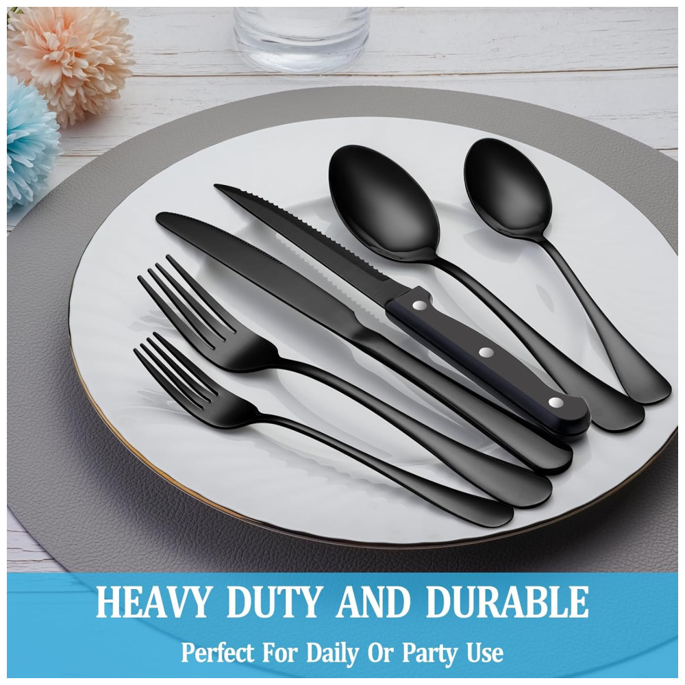 Jogo de Talheres Preto 24 Peças com Facas de Churrasco MUTNITT Aço Inox para 4 Pessoas Utensílios de Mesa para Casa e Restaurante Resistente à Ferrugem