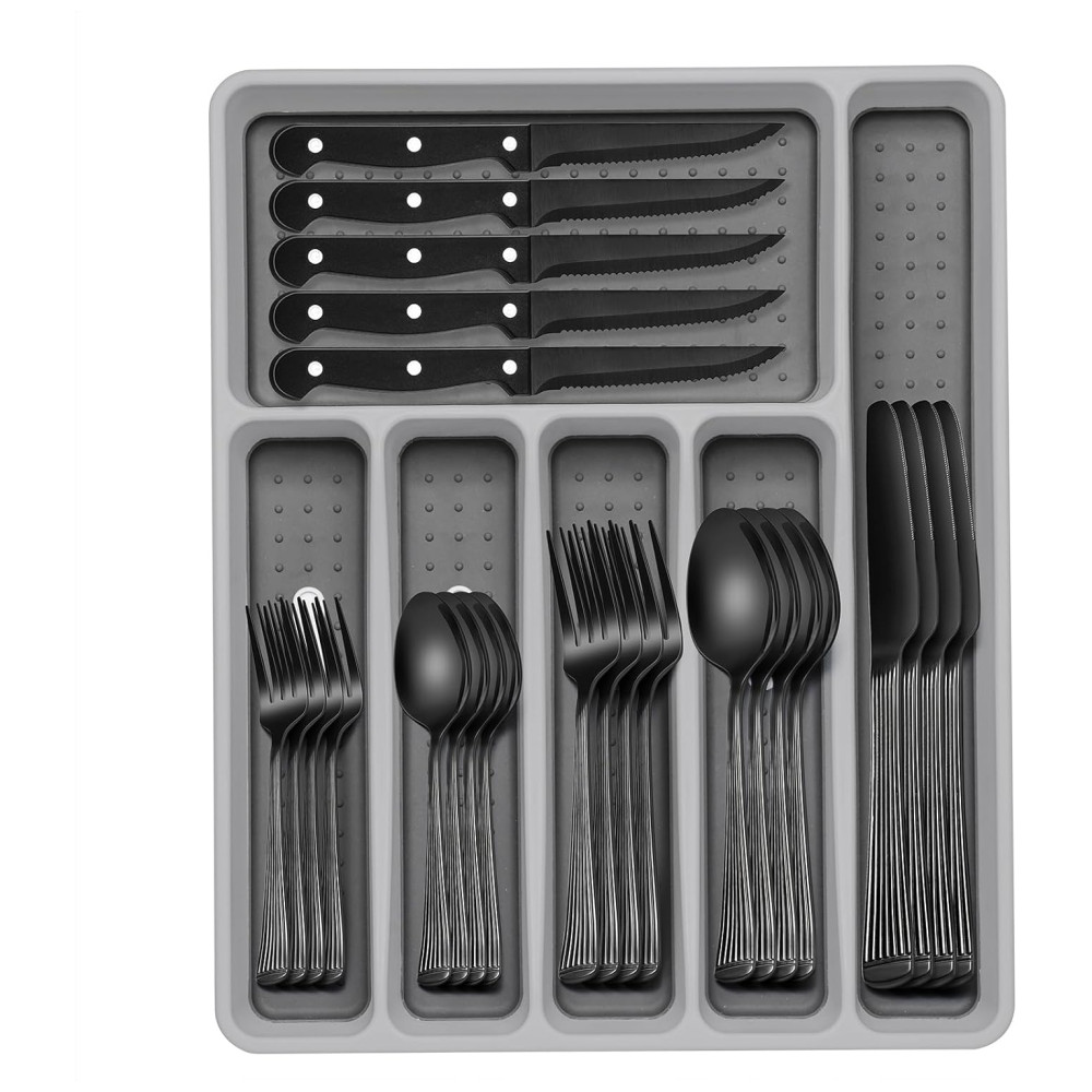 Jogo de Talheres Preto 49 Peças com Organizador em Aço Inox Estilo Coluna Romana para 8 Pessoas Facas de Jantar Resistente à Ferrugem Polido e Durável.EWFEN