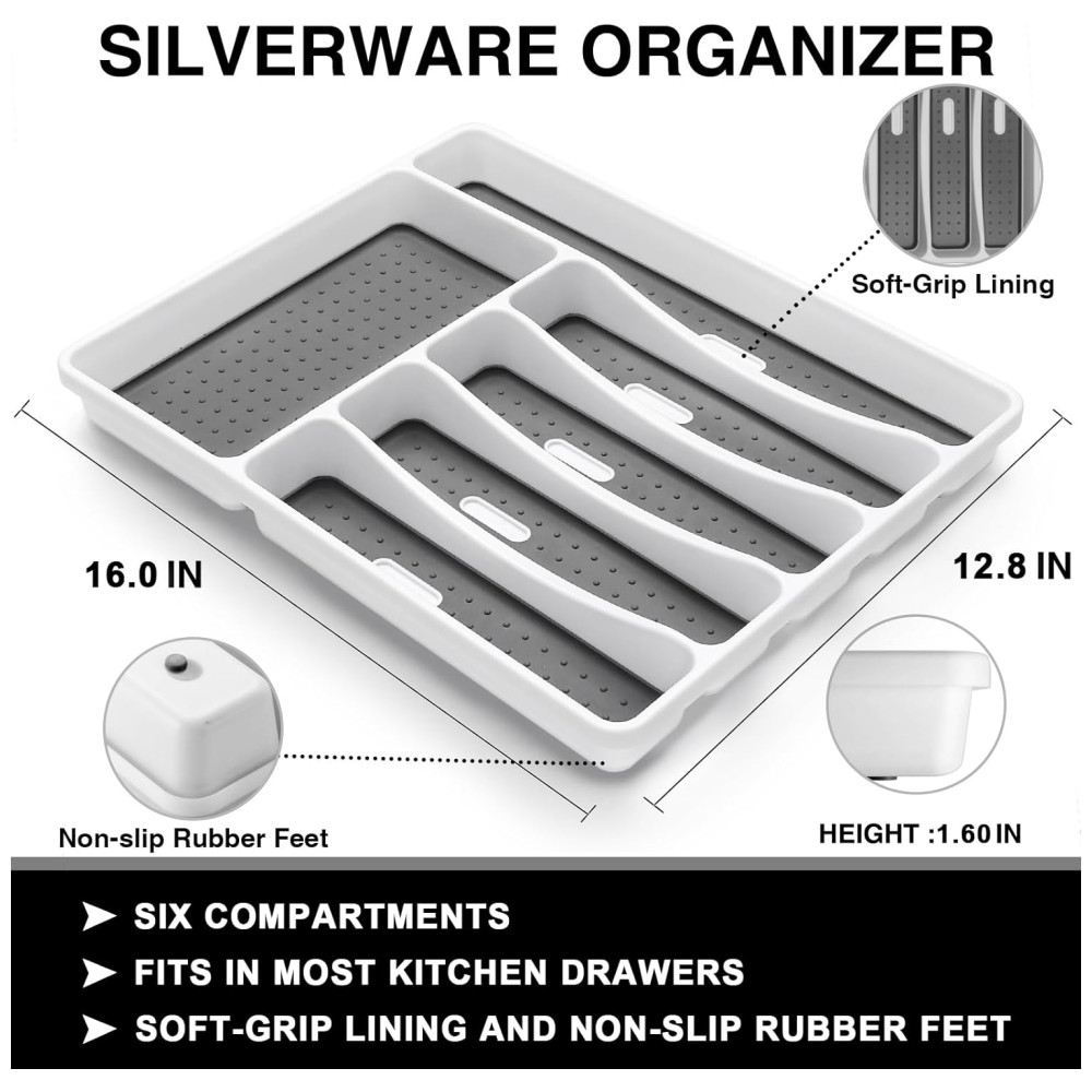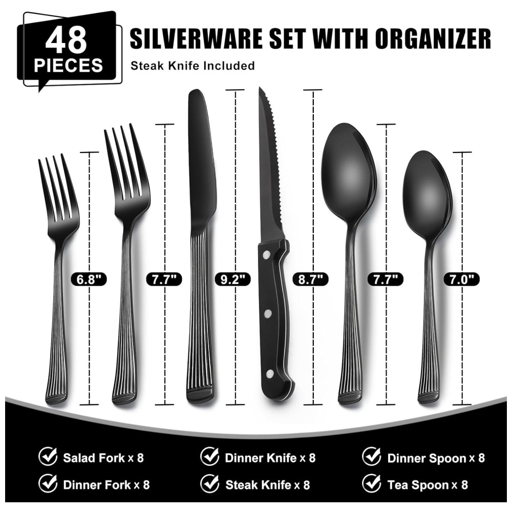 O Conjunto de Talheres Preto de 49 Peças é ideal para servir até 8 pessoas, perfeito para restaurantes, casamentos, eventos e jantares em casa. Feito em aço inoxidável de alta qualidade, resistente à corrosão e ferrugem, garantindo durabilidade. O design confortável e clássico proporciona um toque elegante à mesa. As facas de jantar são perfeitas para cortes precisos. Além disso, o organizador de talheres de 5 compartimentos mantém tudo em ordem na gaveta da cozinha.