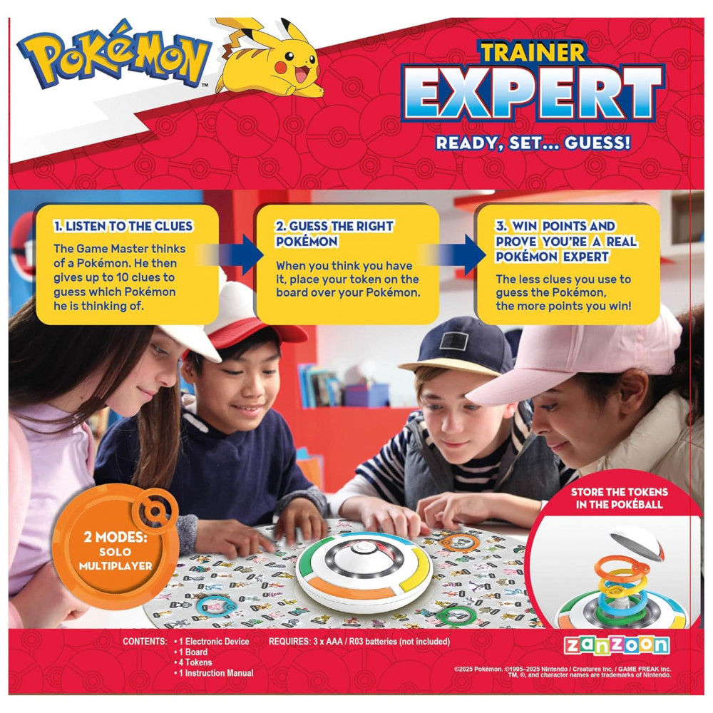 O jogo eletrônico Pokémon Trainer Expert é um jogo de adivinhação em que os participantes utilizam pistas fornecidas por um dispositivo eletrônico para identificar 151 diferentes Pokémon. O módulo atua como mestre do jogo, selecionando um Pokémon e apresentando até 10 pistas em sequência, envolvendo tipo, aparência e características do personagem, enquanto os jogadores analisam as dicas para chegar à resposta correta.