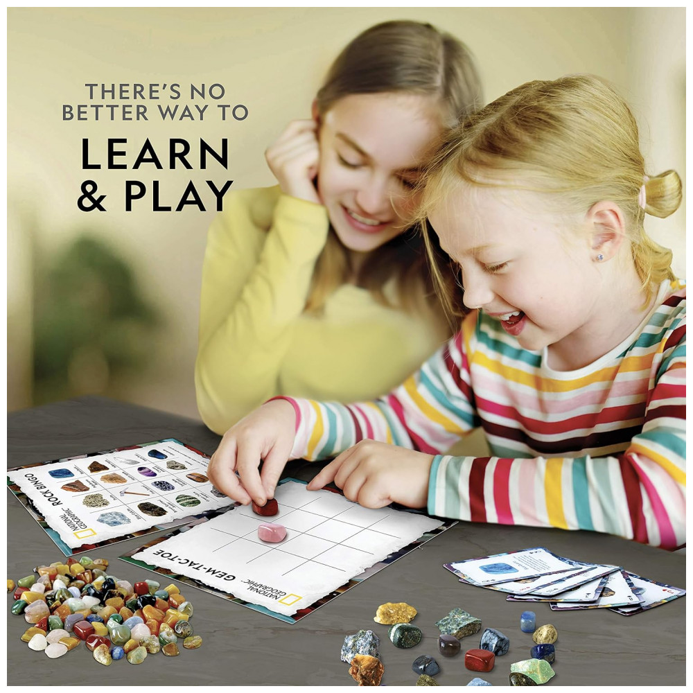 Descubra a geologia de forma envolvente com o jogo National Geographic Rock Bingo! Este conjunto oferece diversão e aprendizado com jogos como bingo de rochas, memória de minerais, trívias de gemas e cartas colecionáveis com mais de 150 rochas e minerais. Além dos jogos, as crianças recebem 25 espécimes de rochas e uma ampla variedade de gemas. As cartas contêm fatos fascinantes sobre as rochas e gemas, podendo ser usadas em jogos de cartas tradicionais ou como cartas flash. Incentive a aprendizagem STEM de forma divertida e interativa para crianças a partir de 6 anos!