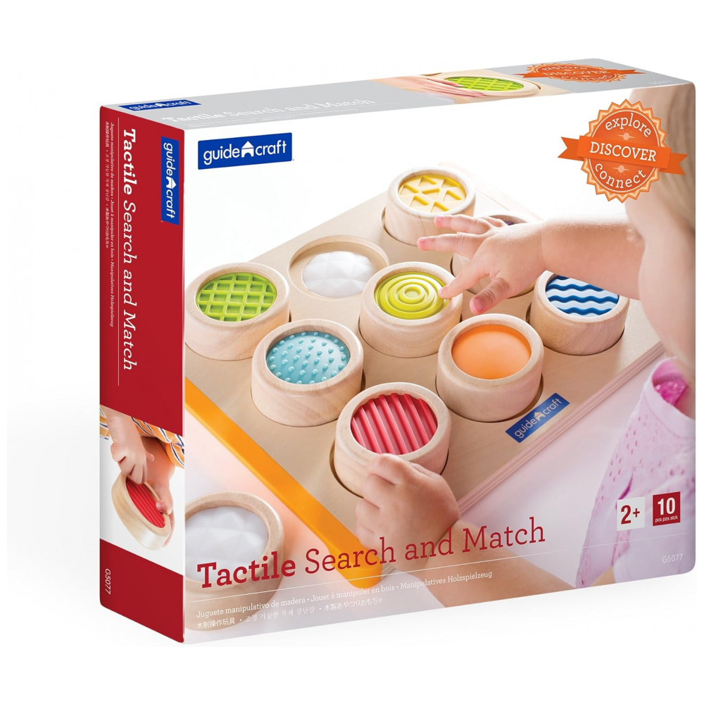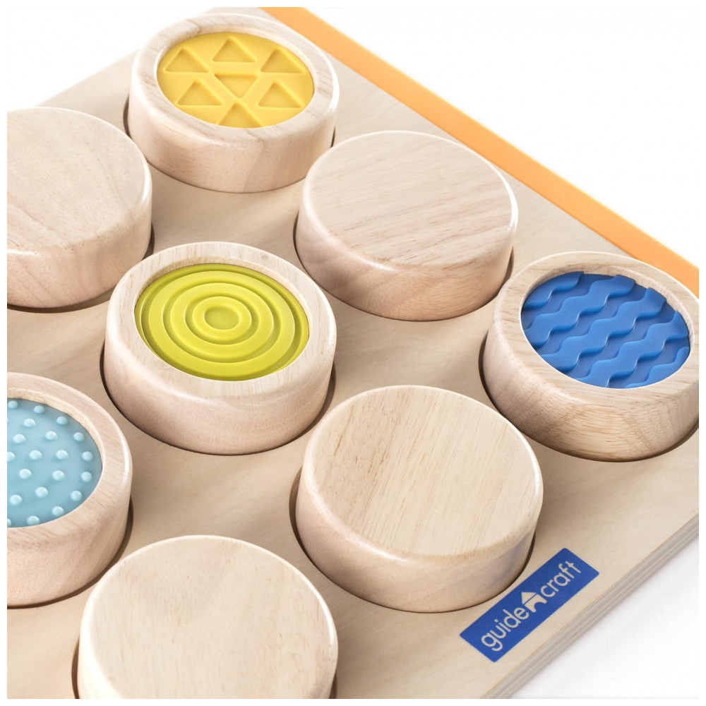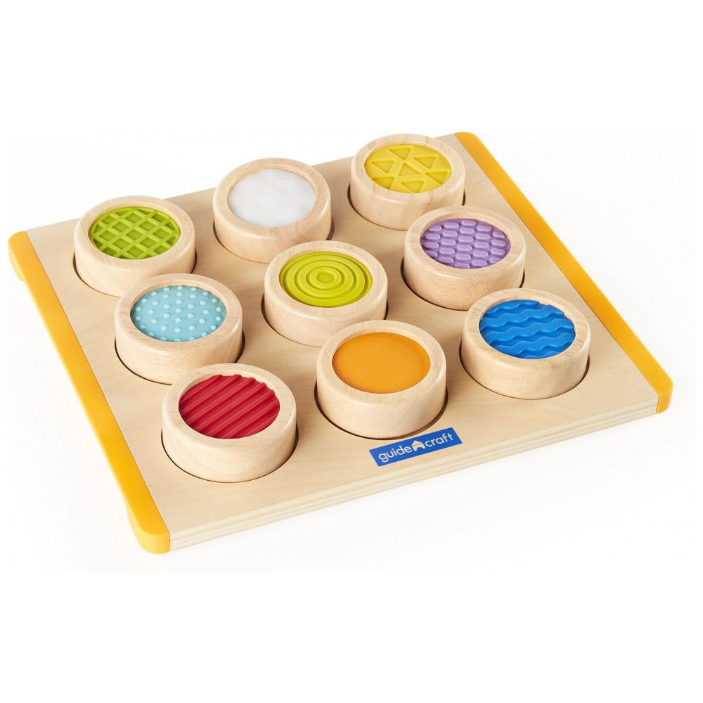O Guidecraft Colorful Tactile Search and Match é um jogo sensorial de memória desenvolvido para crianças a partir de 2 anos, focado em discriminação tátil, atenção e habilidades de pareamento. O tabuleiro robusto traz nove áreas com diferentes texturas, que correspondem a nove peças espessas em madeira de seringueira, permitindo que a criança sinta e associe cada textura ao local correto.