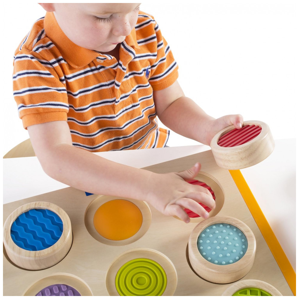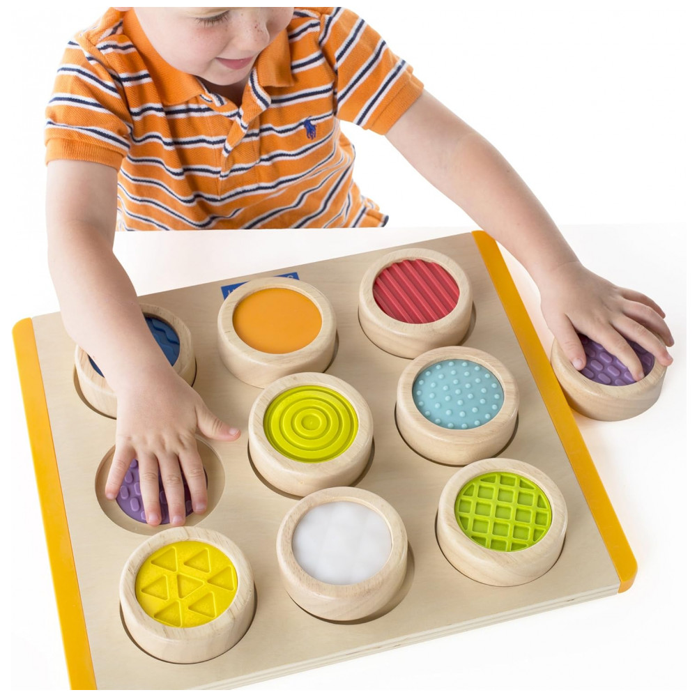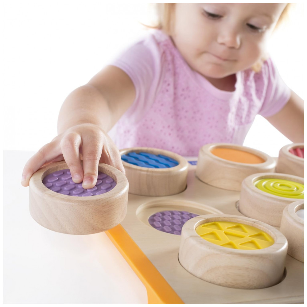 Durante a atividade, a criança pode virar ou esconder as peças e usar apenas o tato para identificar superfícies macias, ásperas, lisas e outras variações, reforçando percepção tátil e vocabulário descritivo. O tabuleiro é fabricado em madeira com alças sobremoldadas em plástico macio para facilitar o transporte, e o conjunto é adequado para uso individual em casa, escolas de educação infantil ou espaços terapêuticos.