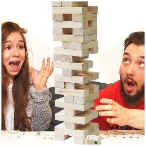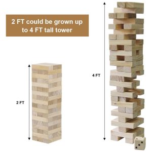 A torre gigante tem dimensões totais de 6 x 6 x 59,69 cm, alcançando até 1,22 metros de altura quando montada com suas 18 linhas. Além dos blocos padrão, o jogo também conta com seis blocos marcados e um dado extra. Este dado adicional permite criar variantes no jogo: basta rolar o dado e mover o número de blocos correspondente ao resultado.