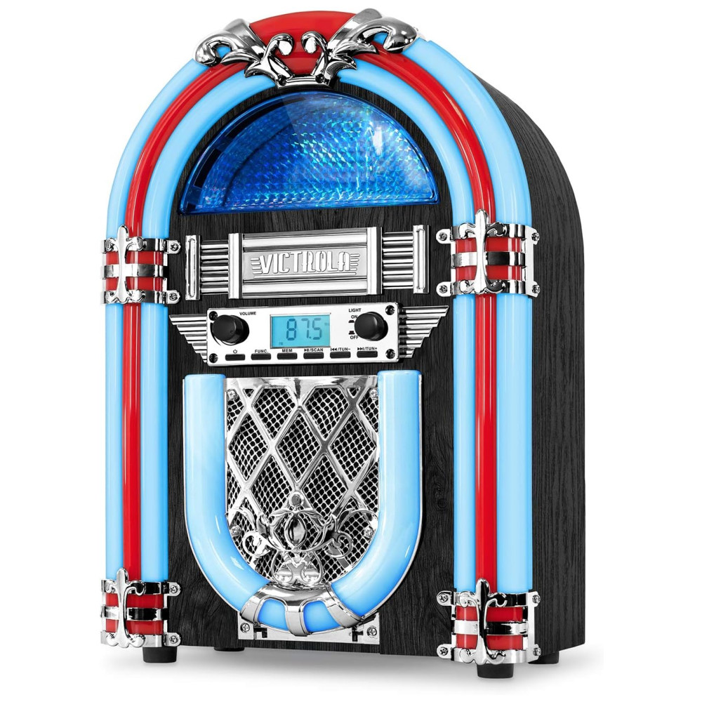 VIBE VINTAGE DOS ANOS 50 COM RECURSOS MODERNOS Reacenda memórias antigas com a nostálgica jukebox de bancada Bluetooth da Victrola com alto falante embutido. Este rádio com excelente qualidade de som e 5 tubos de LED que mudam de cor jazz é um ótimo complemento para sua coleção