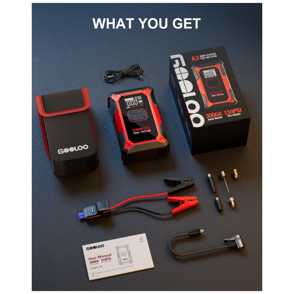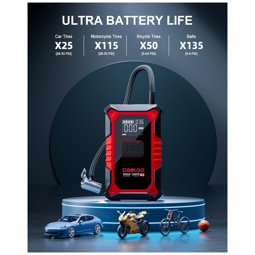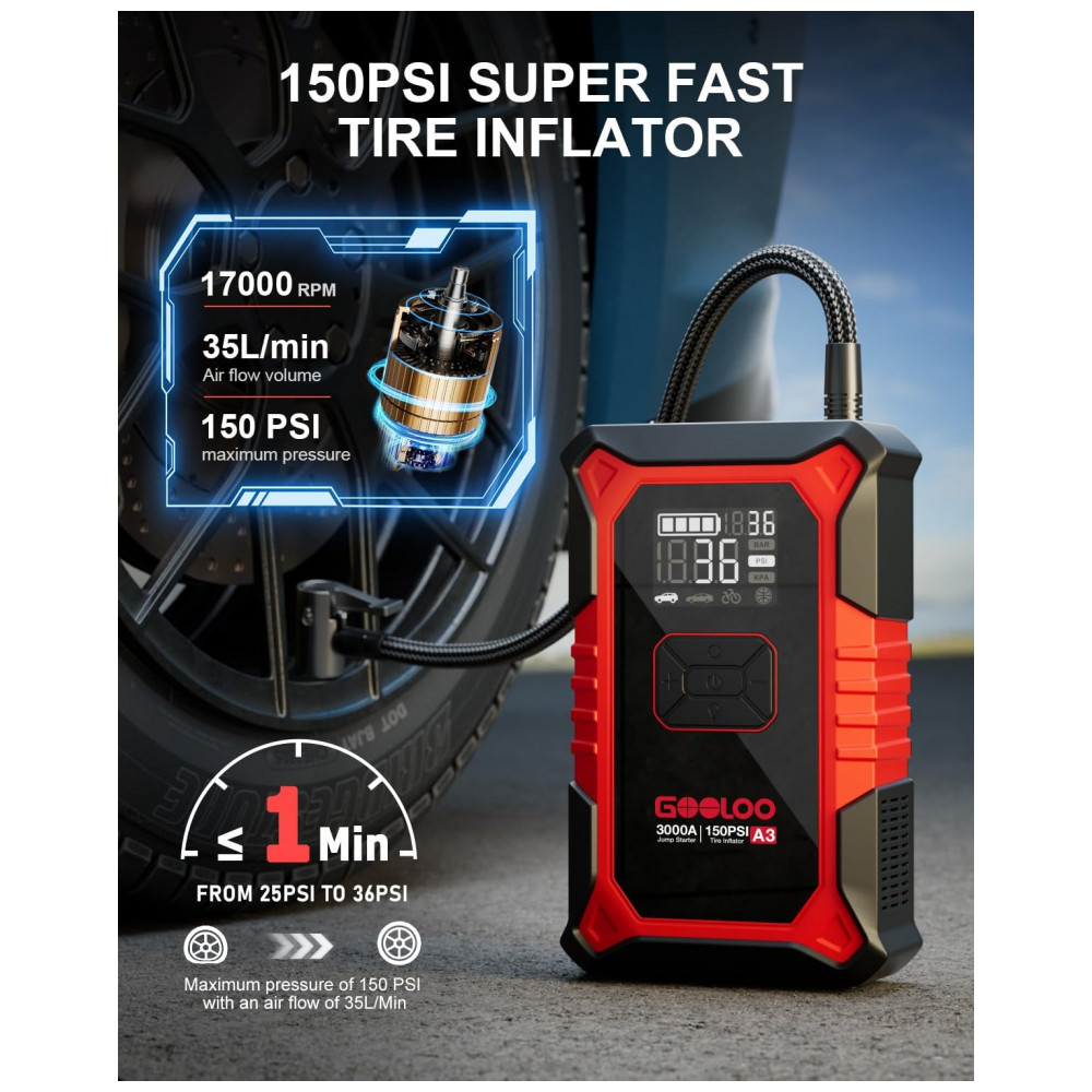 O GOOLOO A3 é um dispositivo portátil multifuncional que combina partida de emergência para veículos 12V e compressor de pneus com desligamento automático a 150 PSI, compatível com motores a gasolina até 9,0 L e diesel até 6,5 L. Utiliza bateria de lítio com corrente de pico de 3000A e proteções elétricas contra curto-circuito, inversão de polaridade e sobrecarga para operação segura em baterias descarregadas.
