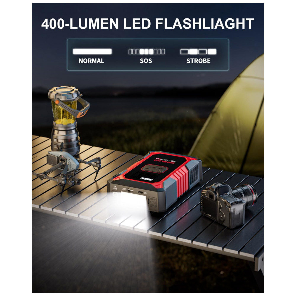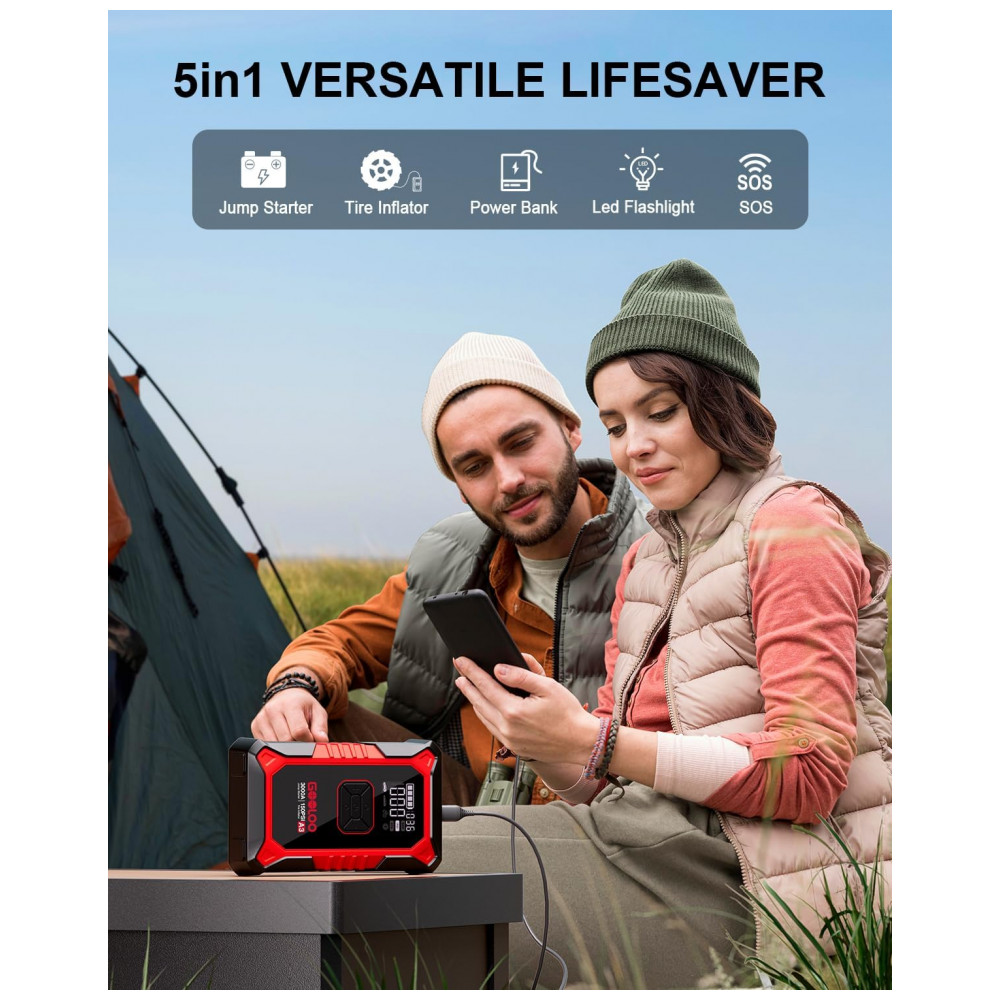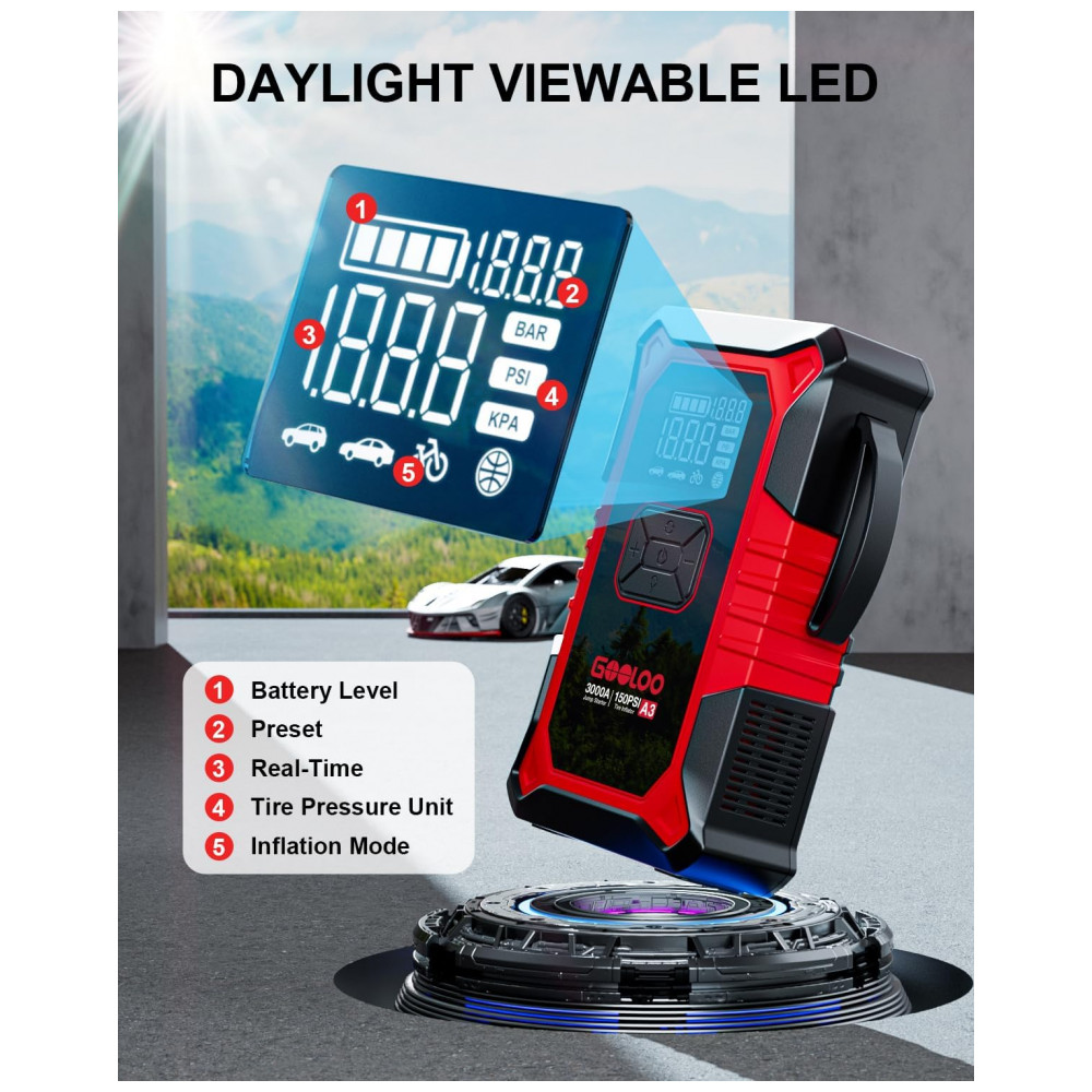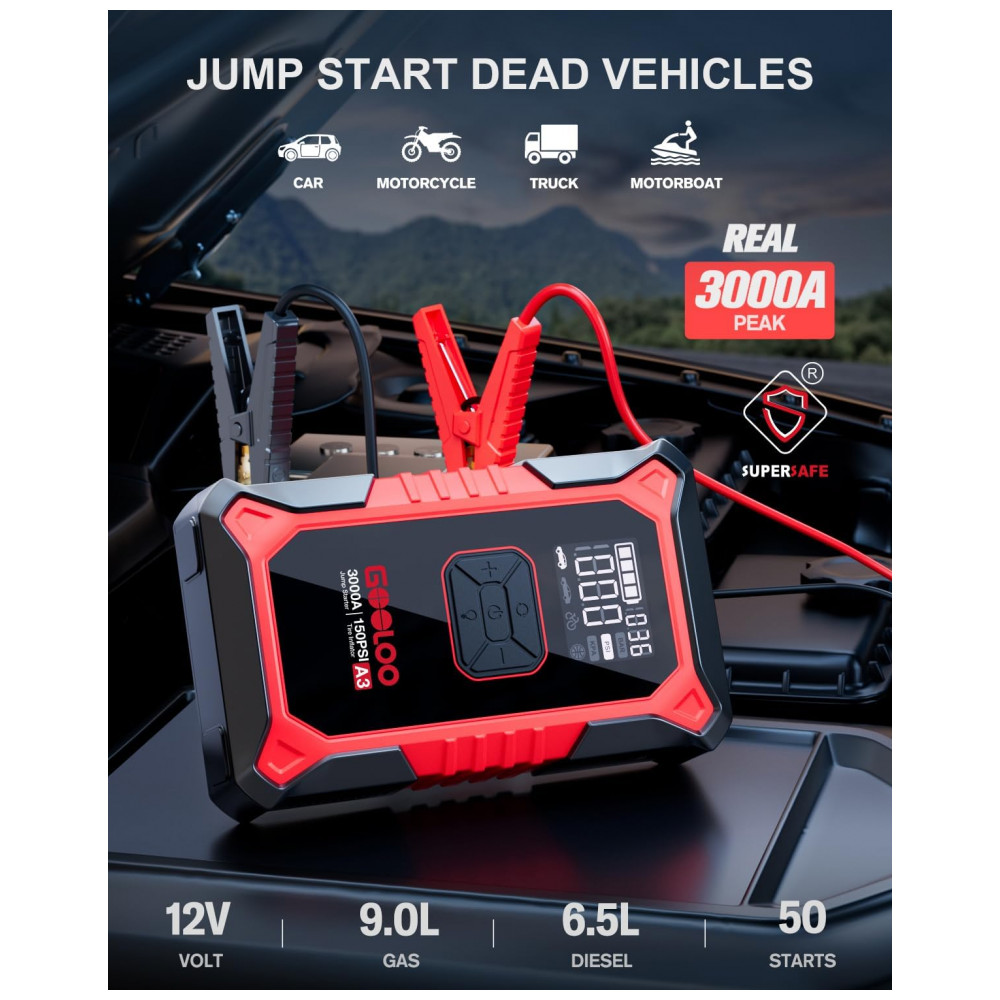 O GOOLOO A3 é um dispositivo portátil multifuncional que combina partida de emergência para veículos 12V e compressor de pneus com desligamento automático a 150 PSI, compatível com motores a gasolina até 9,0 L e diesel até 6,5 L. Utiliza bateria de lítio com corrente de pico de 3000A e proteções elétricas contra curto-circuito, inversão de polaridade e sobrecarga para operação segura em baterias descarregadas.