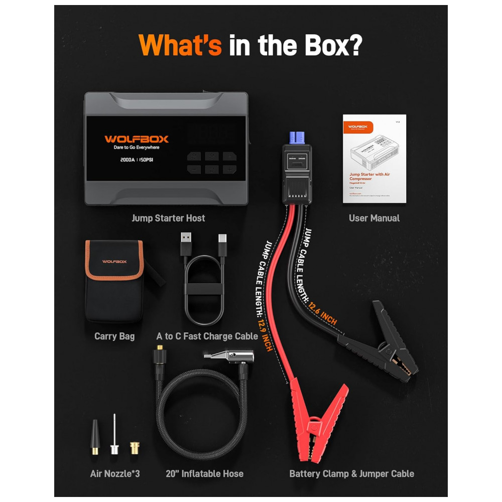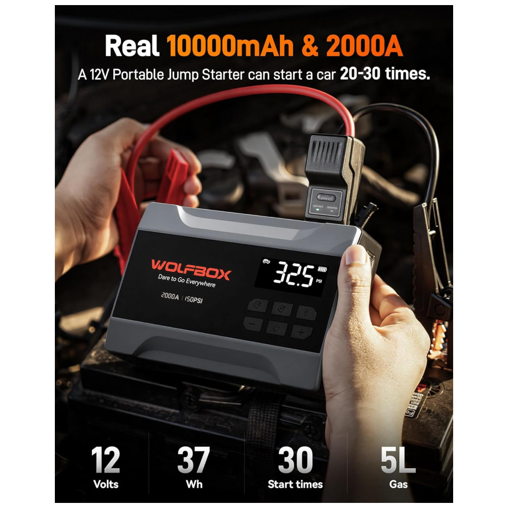 Jump Starter (Aux.de partida) com Compressor WOLFBOX 2000A Preto 37Wh 150 PSI Gasolina 5L 12V