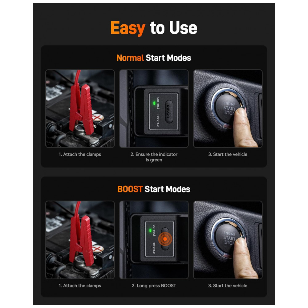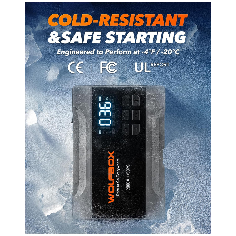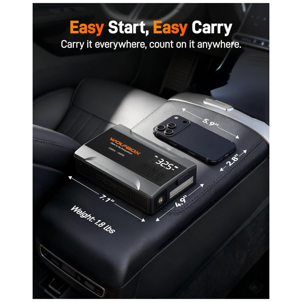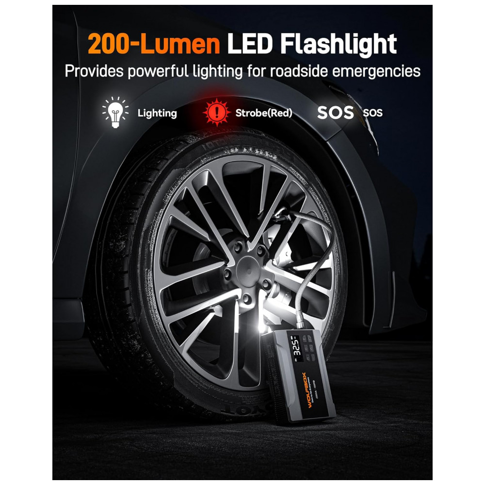 O WOLFBOX é um jump starter portátil com compressor integrado e capacidade de 37Wh, projetado para partida de veículos 12V com motores a gasolina até 5 L, fornecendo corrente de pico de 2000A. Inclui modo BOOST para baterias de baixa voltagem, proteções contra curto-circuito, inversão de polaridade e sobrecarga, além de cabos jumper inteligentes.