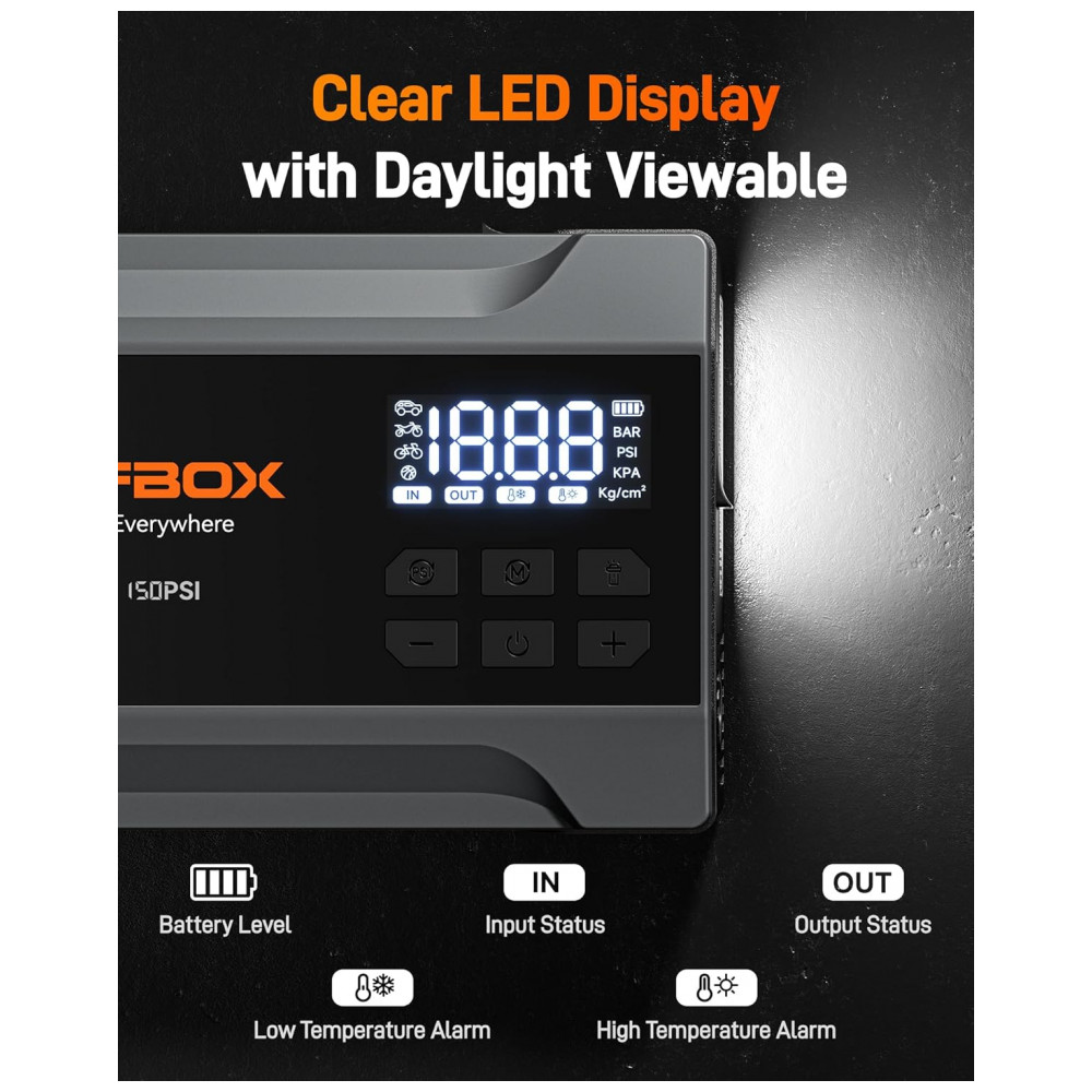 O compressor atinge 150 PSI com manômetro digital e auto-shutoff, compatível com pneus de carros pequenos, motos e acessórios esportivos. Possui luzes LED multifuncionais e saídas USB para carregamento de dispositivos. Armazene entre 0°C e 40°C em local seco; recarregue a cada 3 meses se ocioso e evite exposição direta à água.