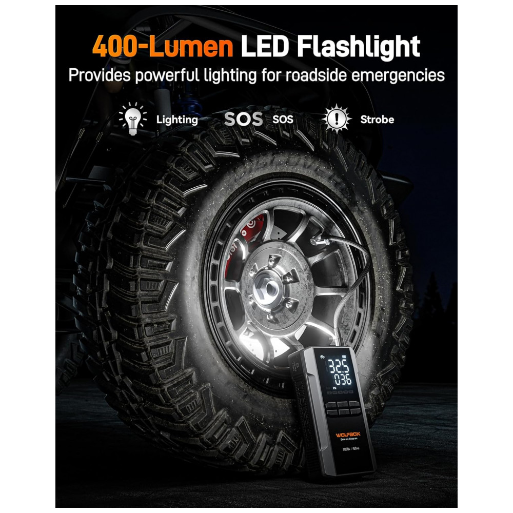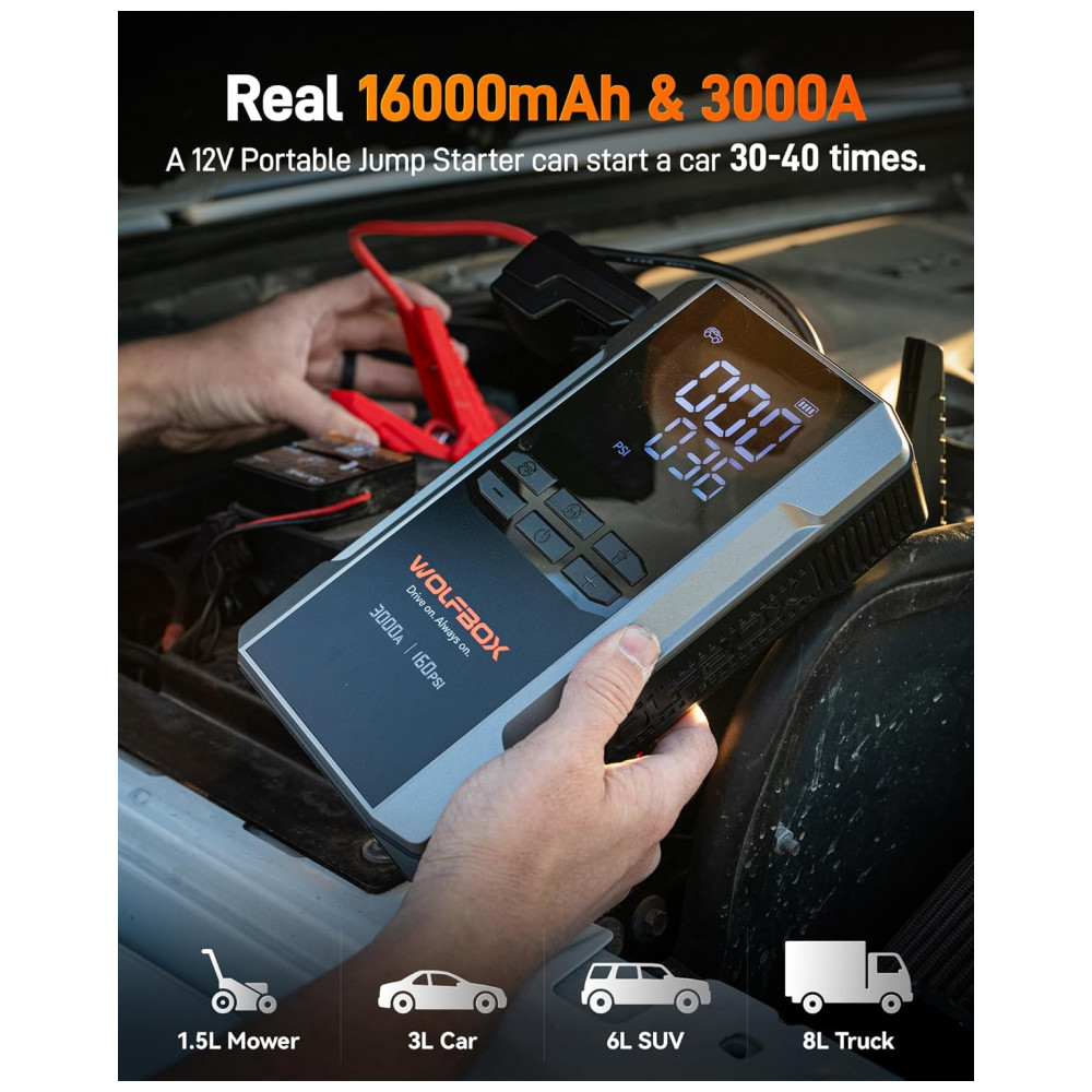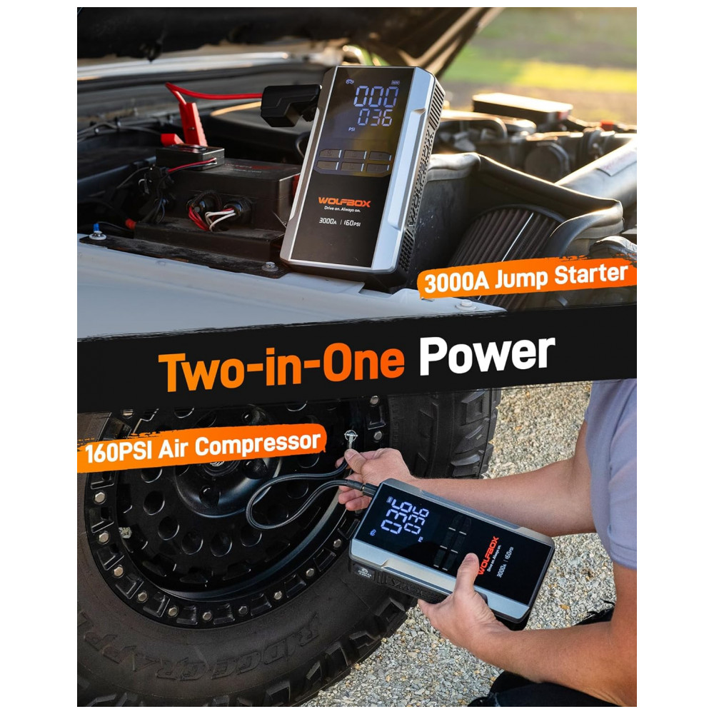 Jump Starter (Aux.de partida) com Compressor WOLFBOX 3000A Preto 59.2Wh 160 PSI Gasolina 8L Diesel 6L 12V