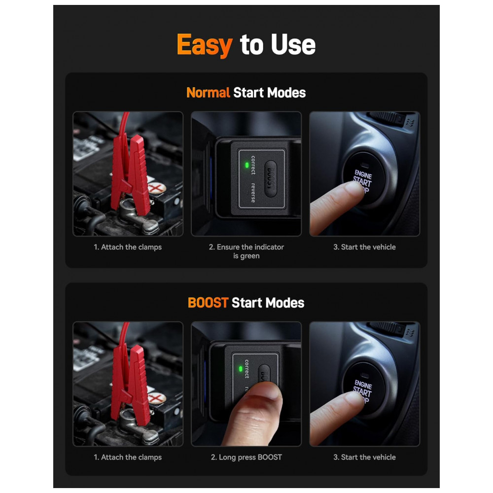 O WOLFBOX é um jump starter portátil com compressor integrado e capacidade de 59.2Wh, projetado para partida de veículos 12V com motores a gasolina até 8 L e diesel até 6 L, fornecendo corrente de pico de 3000A. Inclui modo BOOST para baterias de baixa voltagem, carregamento rápido de 65W via USB-C e proteções contra curto-circuito, inversão de polaridade e sobrecarga.