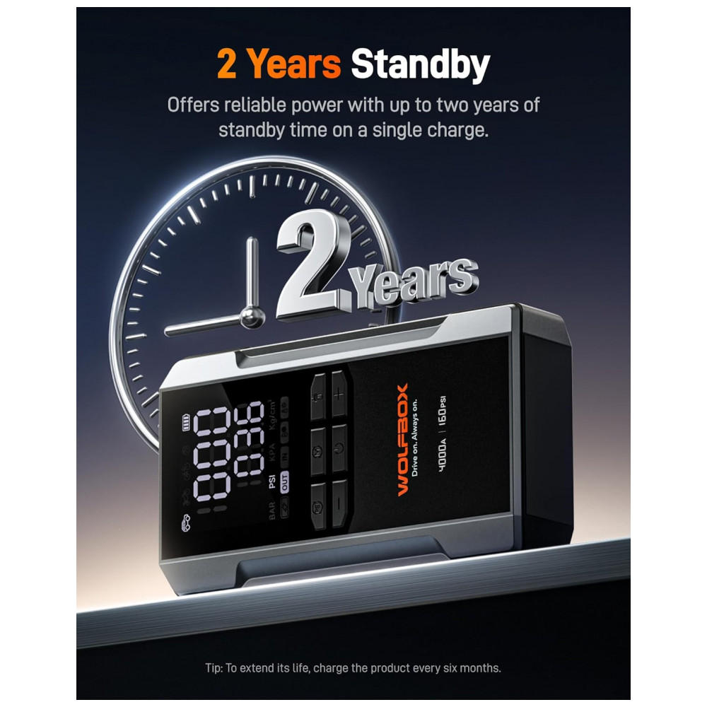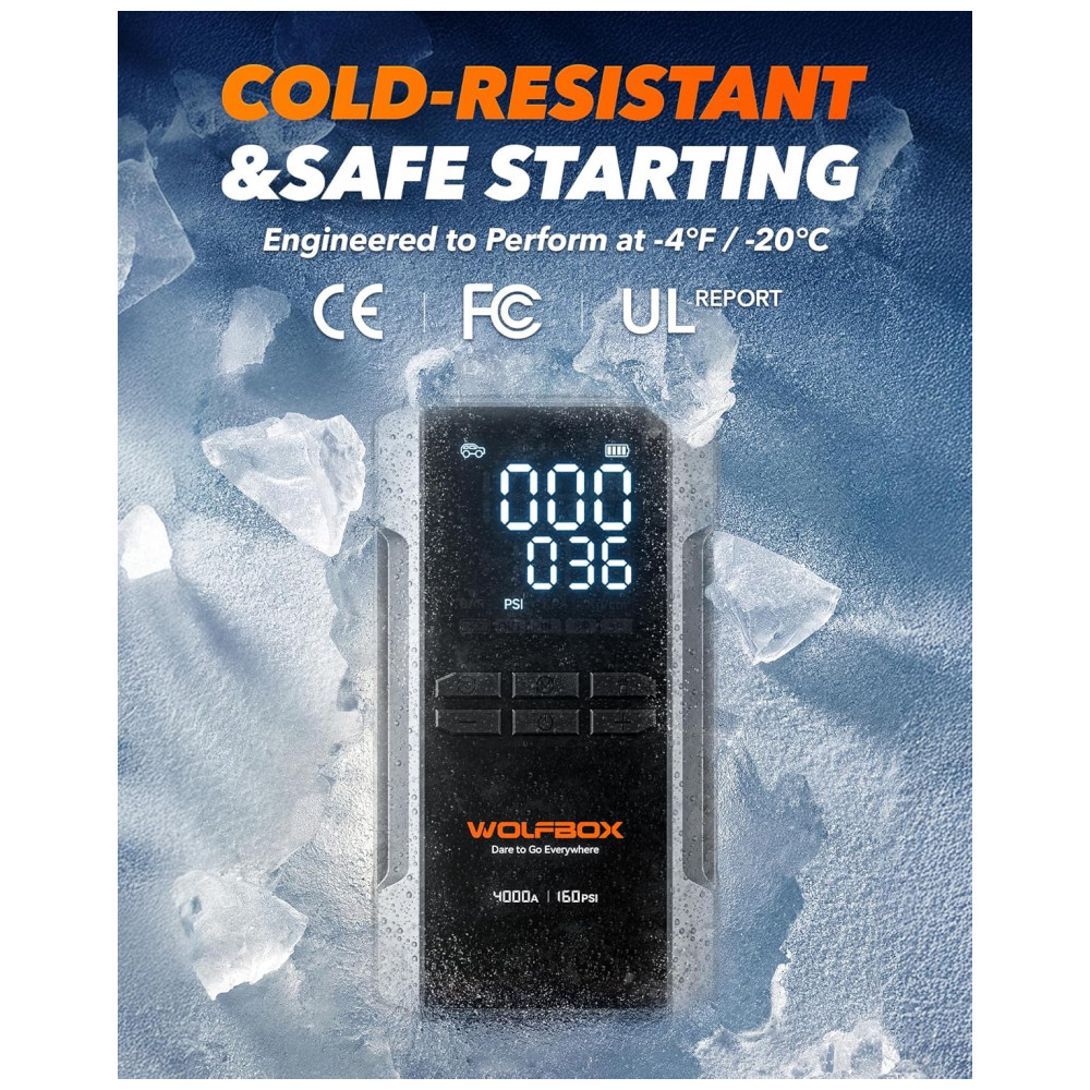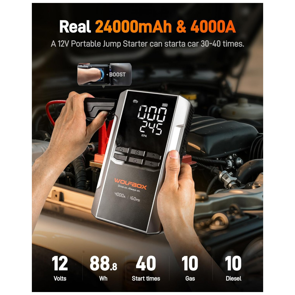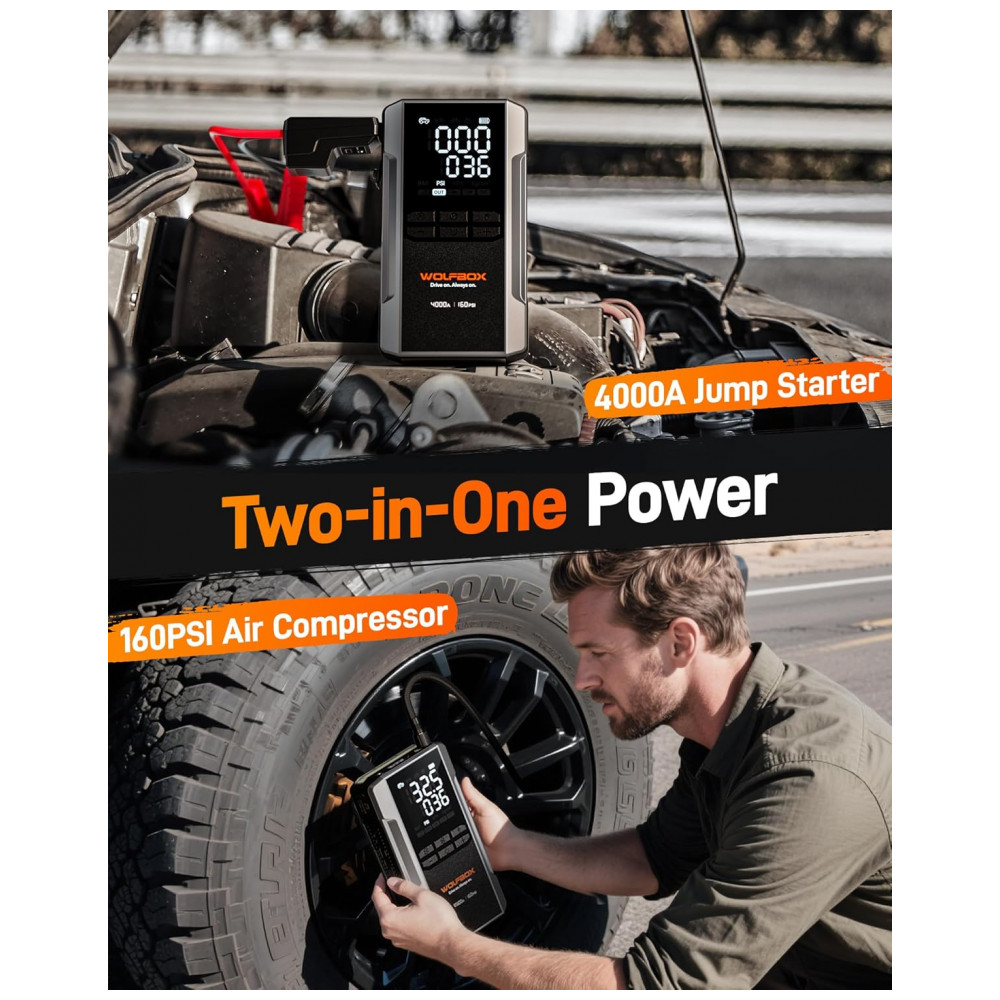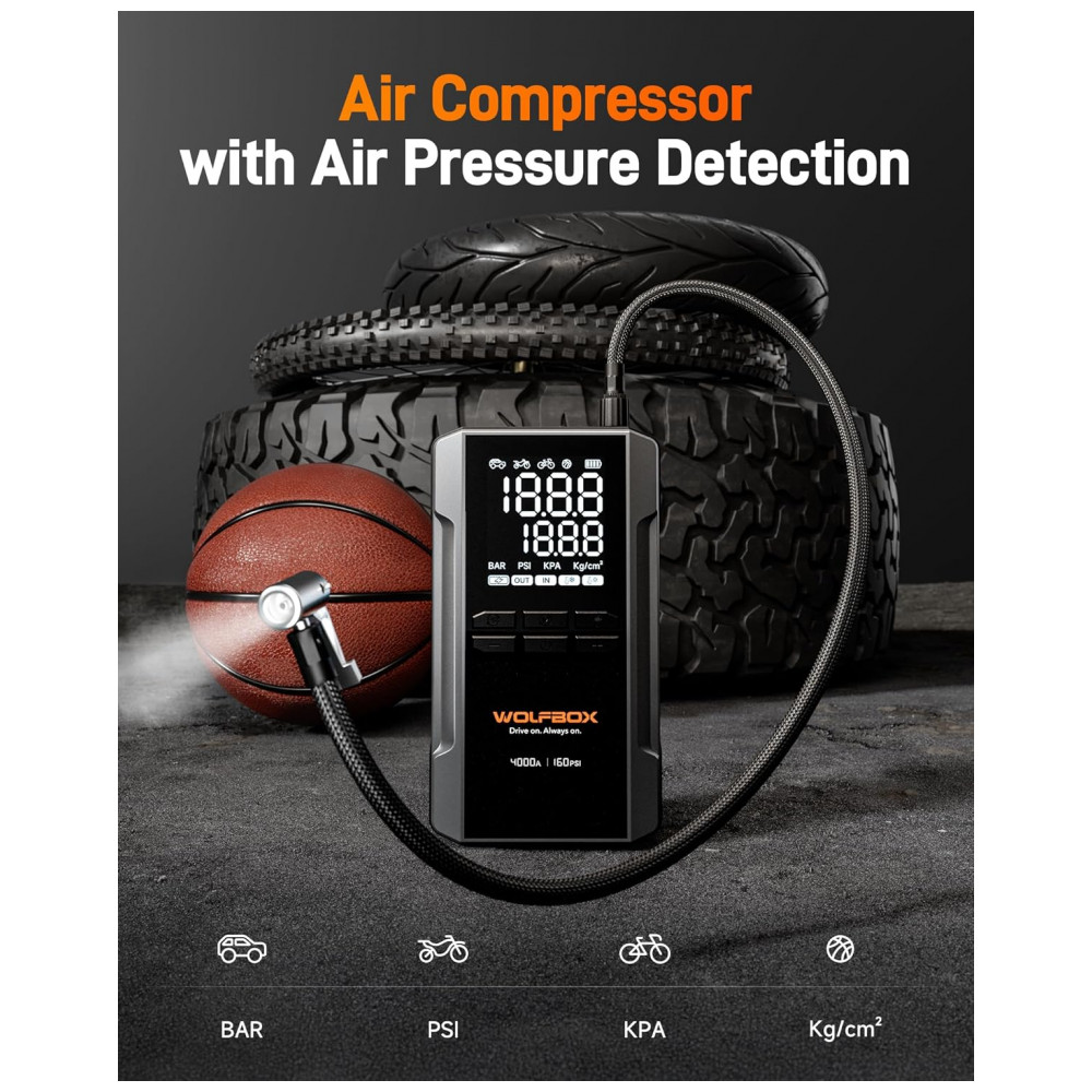 Jump Starter (Aux.de partida) com Compressor WOLFBOX 4000A Preto 88.8Wh 160 PSI Gasolina 10L Diesel 10L 12V