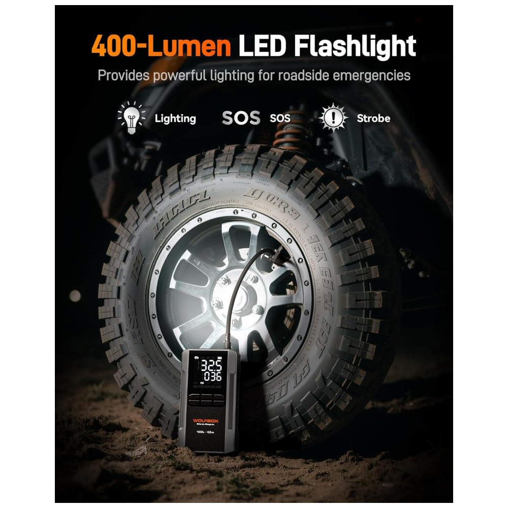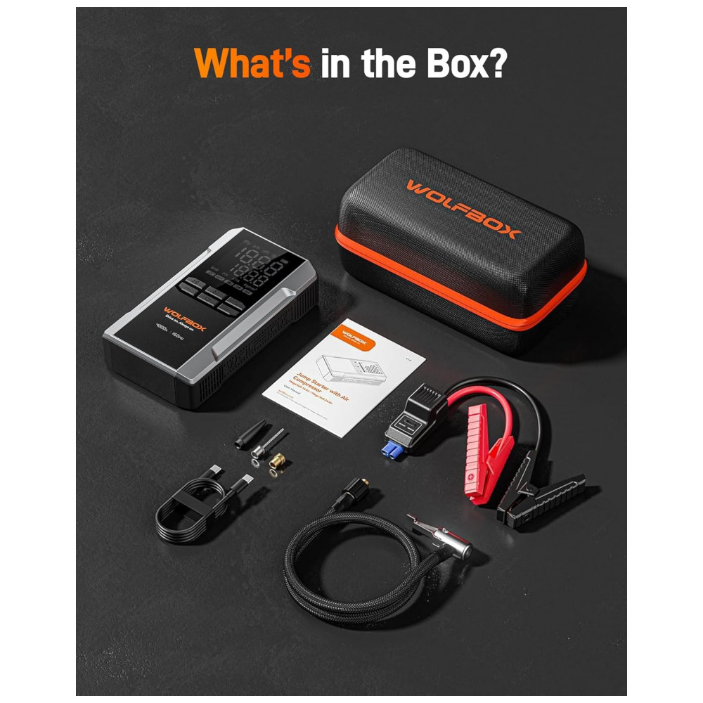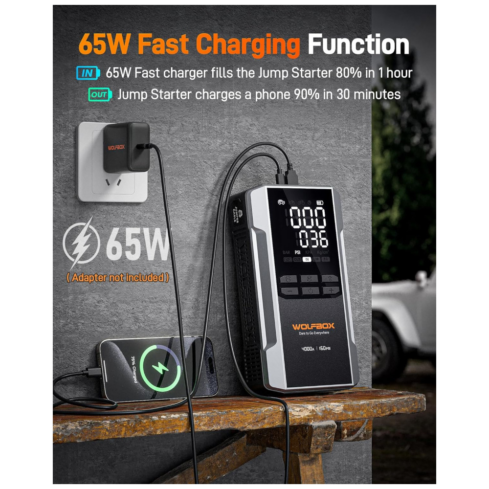 O WOLFBOX é um jump starter portátil com compressor integrado, projetado para partida de veículos 12V com motores a gasolina até 10 L e diesel até 10 L, equipado com bateria de 88.8Wh e corrente de pico de 4000A. Inclui carregamento rápido de 65W via USB-C e cabos jumper com proteções contra curto-circuito e inversão de polaridade para uso seguro em baterias descarregadas.