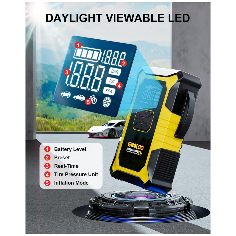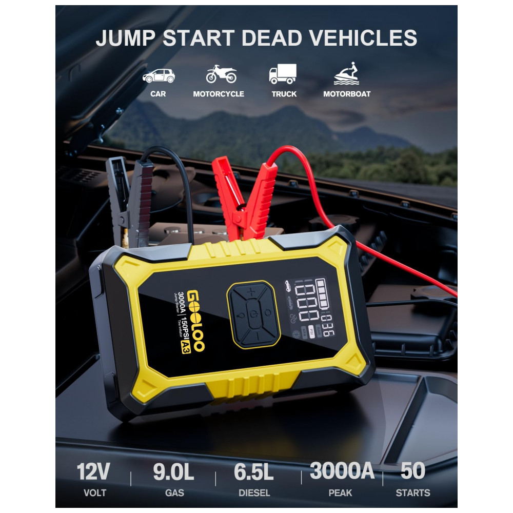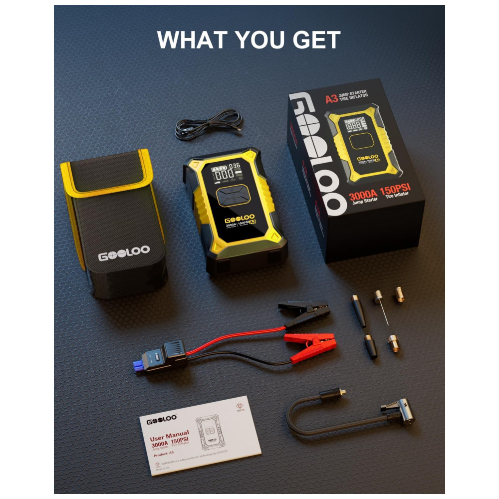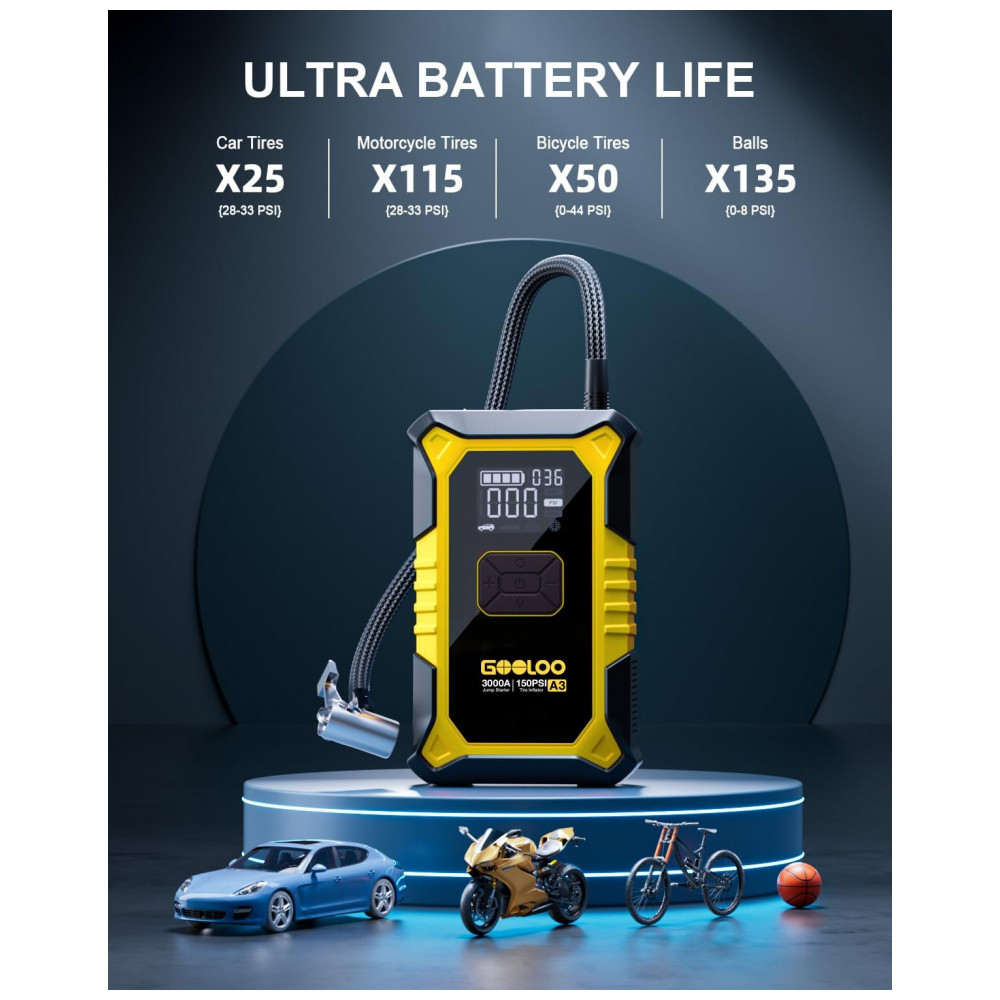 Jump Starter(Aux.de partida) com Compressor GOOLOO A3 Amarelo 3000A 150 PSI Gasolina 9.0L Diesel 6.5L 12V
