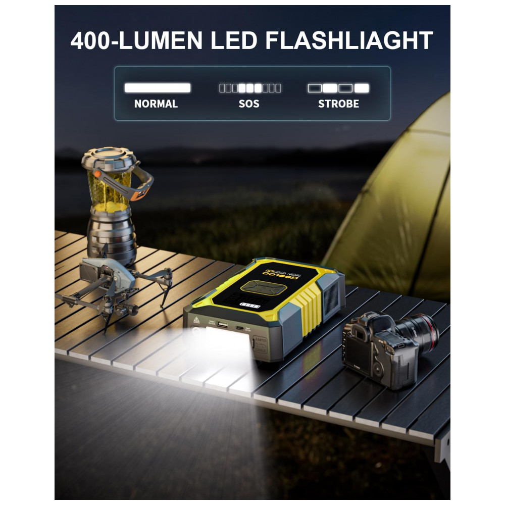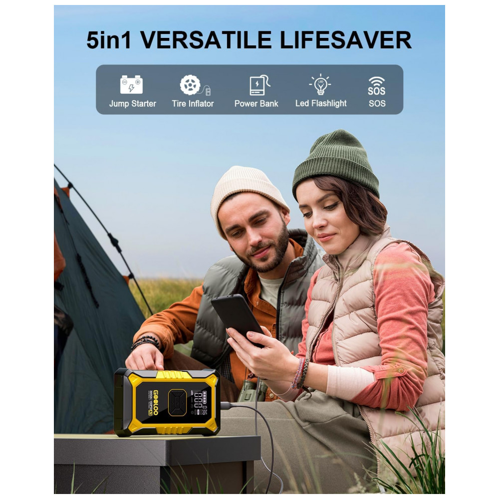 O GOOLOO A3 é um dispositivo portátil multifuncional que integra partida de emergência para veículos e compressor de pneus com desligamento automático, projetado para motores a gasolina até 9,0 L e diesel até 6,5 L em sistemas 12V. Equipado com bateria de lítio de alta densidade, oferece corrente de pico de 3000A para inicialização rápida de baterias descarregadas, com proteção contra inversão de polaridade e sobrecorrente.