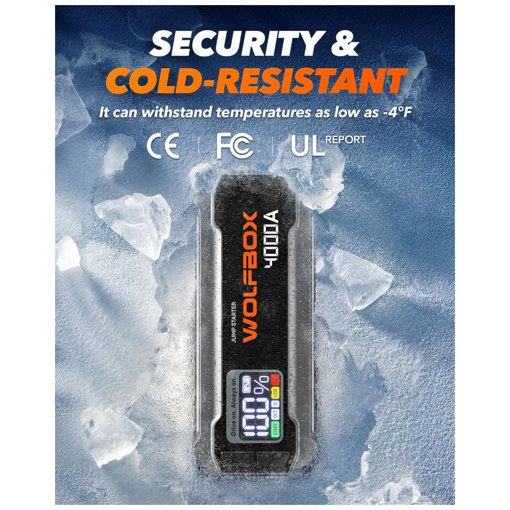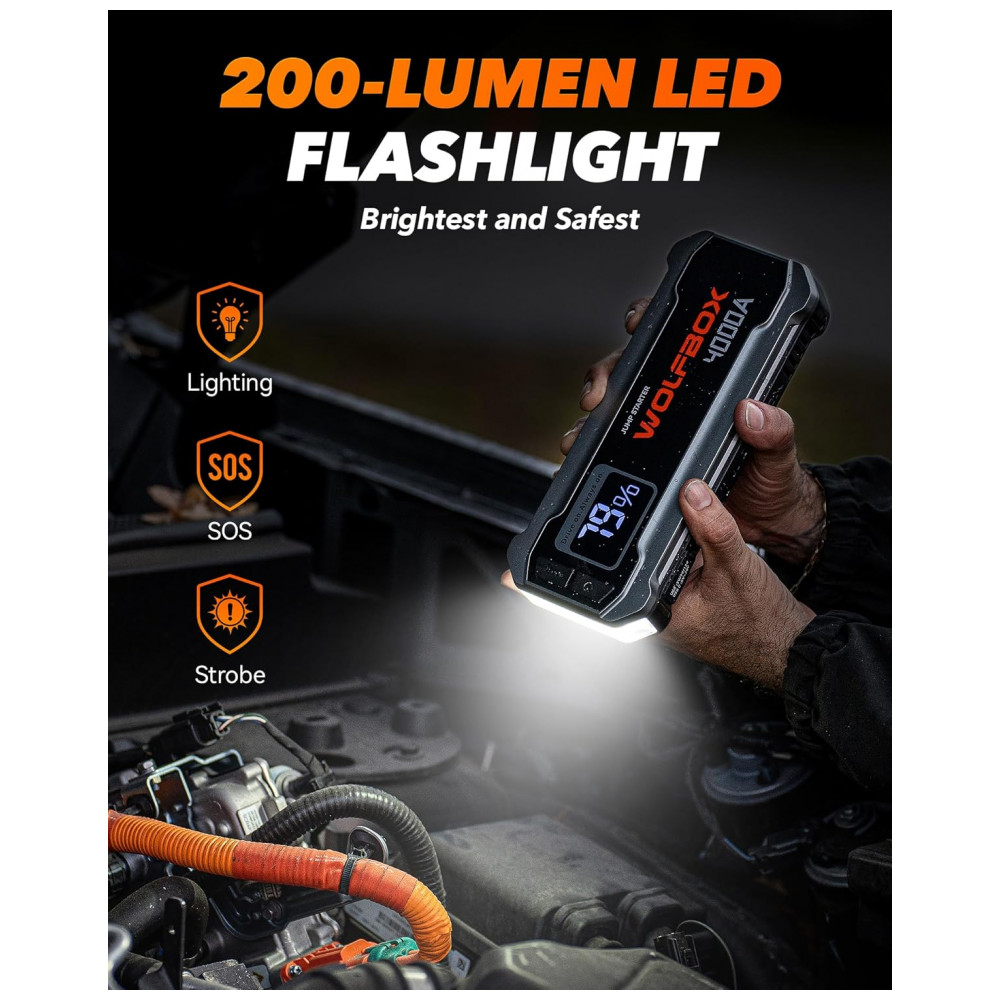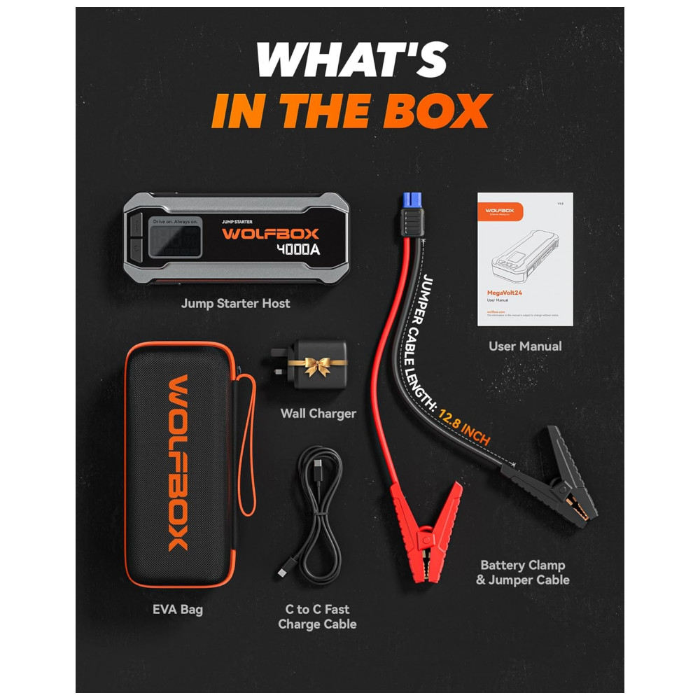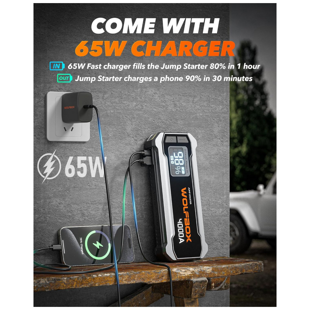 Jump Starter(Aux. de partida) WOLFBOX 4000A Preto 88.8Wh 65W Carregamento Rápido Gasolina 10L Diesel 10L 12V