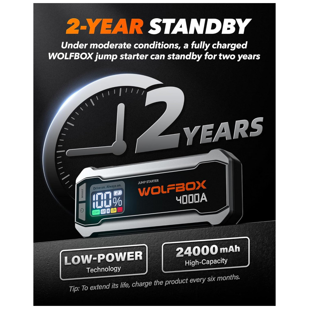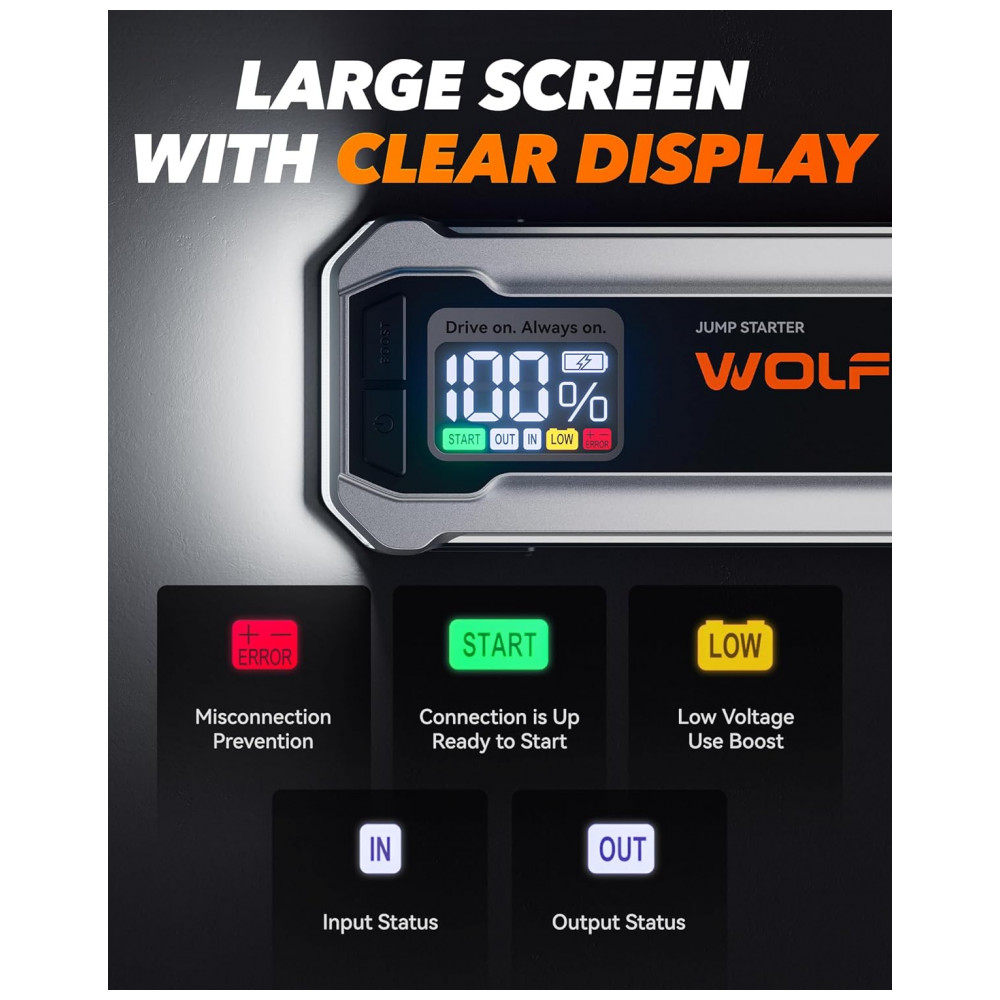 O WOLFBOX é um jump starter portátil com capacidade de 88.8Wh, projetado para partida de veículos 12V incluindo motores a gasolina até 10 L e diesel até 10 L, com corrente de pico de 4000A e display LED para monitoramento de status. Suporta carregamento rápido de 65W via USB-C e cabos jumper com múltiplas proteções contra curto-circuito, inversão de polaridade e sobrecarga para operação segura.