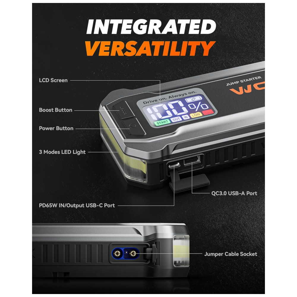 Equipado com luzes LED multifuncionais e saídas USB para power bank, é compatível com carros, SUVs e caminhões leves em condições variadas. Para cuidados, armazene em local seco entre 0°C e 45°C, recarregue a cada 3 meses se ocioso e limpe externamente com pano seco.