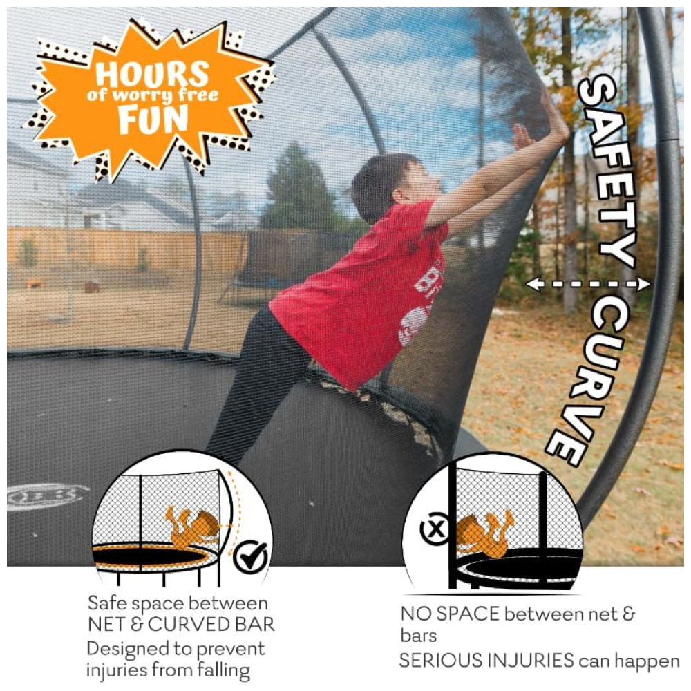 Para a segurança da sua família, inovamos nossos trampolins para crianças e adultos com bastões curvos da próxima geração projetados para proteger seus filhos de acidentes ou lesões