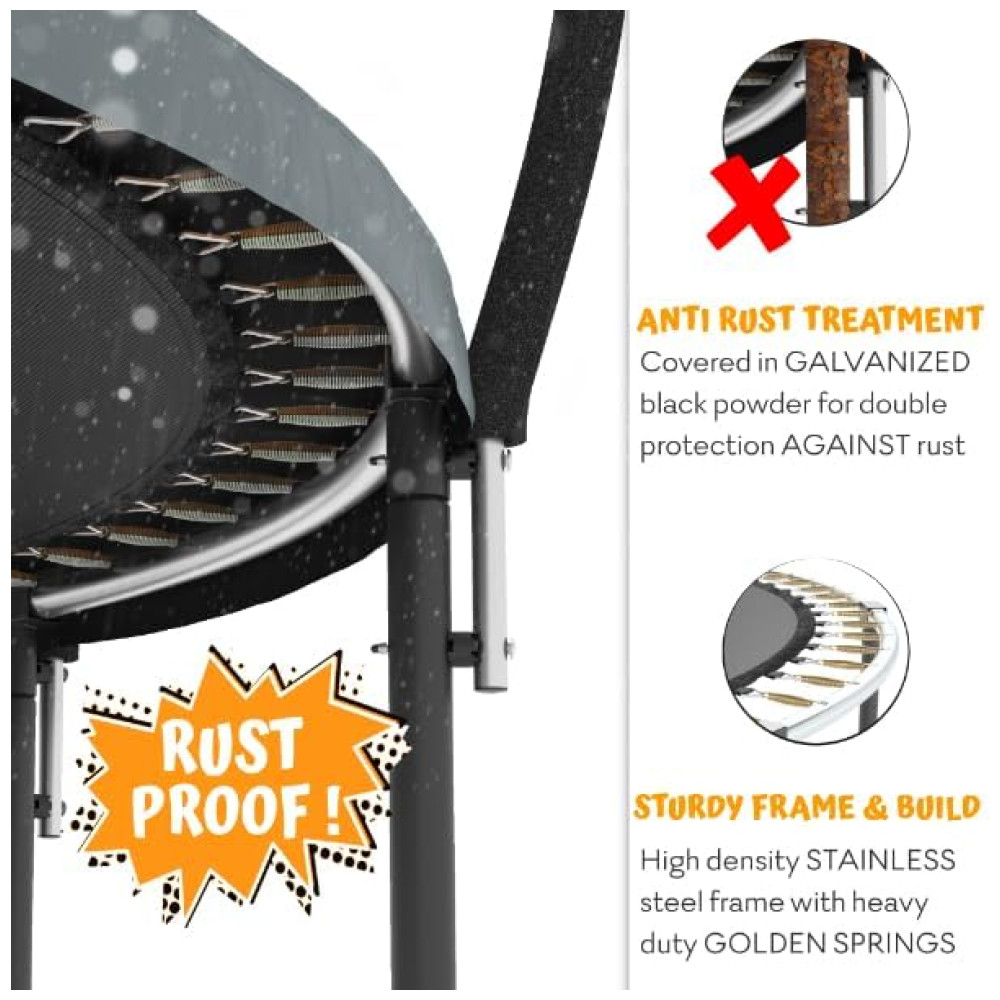 Queremos que o seu Super Trampoline Jumpzylla pareça bem como novo pelo maior tempo possível! A estrutura é galvanizada dentro e as pernas são revestidas em pó para proteção extra contra a ferrugem, a espuma grossa é à prova d’água, então seu novo trampolim tem uma vida útil mais longa do produto