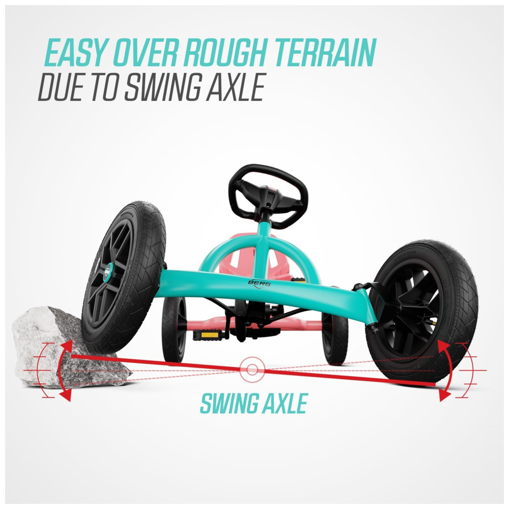 SEGURANÇA EM PRIMEIRO LUGAR Graças às suas 4 rodas, o BERG Buddy Redster tem uma excelente estabilidade, permitindo lhe fazer curvas com rapidez, precisão e segurança. O BERG Buddy também possui um eixo oscilante que cria articulação das rodas dianteiras, garantindo que todas as quatro rodas permaneçam no solo uma solução segura Você não precisará se preocupar com nada durante suas aventuras porque o BERG Buddy atende a todos os requisitos de segurança, tornando o o kart de pedal perfeito para crianças