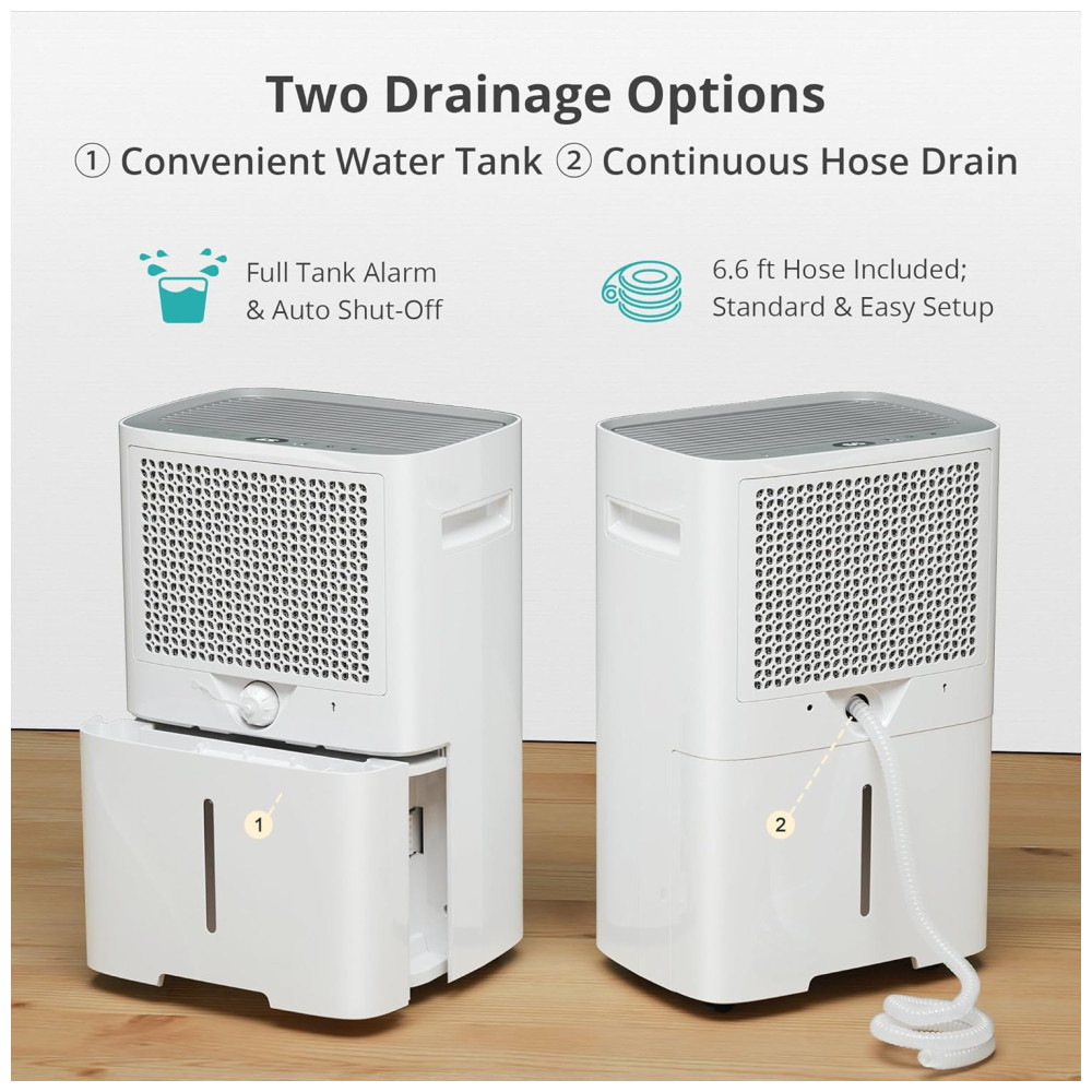 Desumidificador de porão com mangueira de drenagem os desumidificadores para casa funcionarão e serão desligados automaticamente quando chegarem ao ponto. 2 opções de drenagem para suas escolhas de drenagem Drenagem automática com mangueira de drenagem de 2 m 6,56 pés incluída para drenagem automática contínua do desumidificador doméstico sem esvaziar o balde de água. Drenagem manual O tanque de água de 0,6 galões e o indicador de balde cheio permitem que você saiba quando o balde de água precisa ser esvaziado