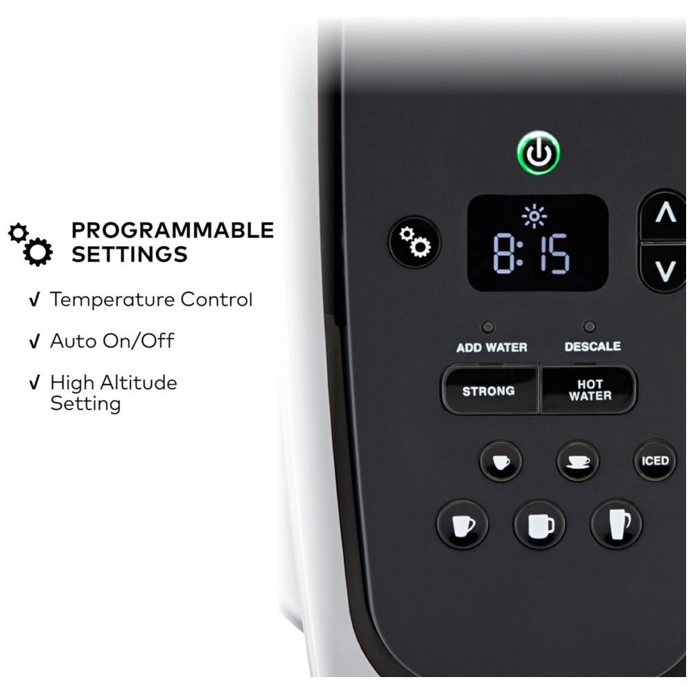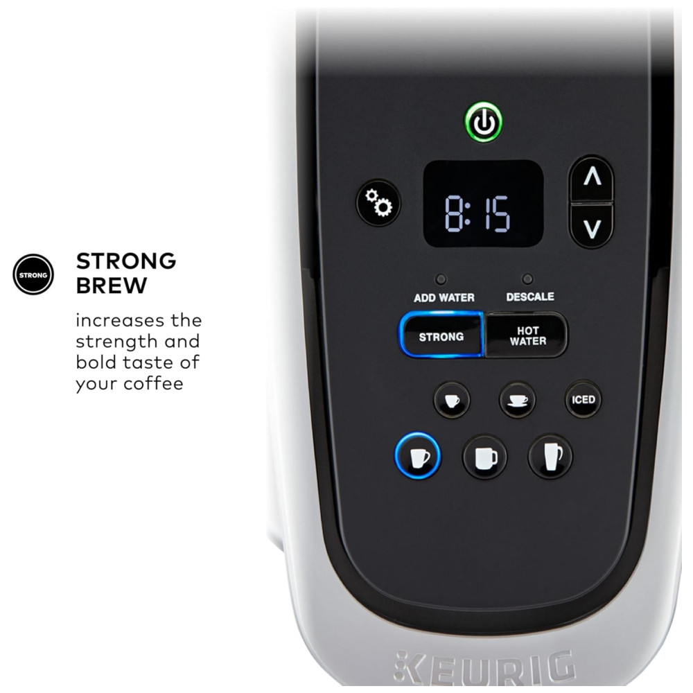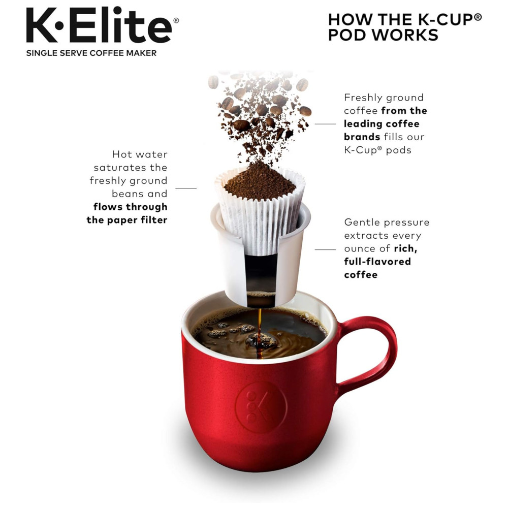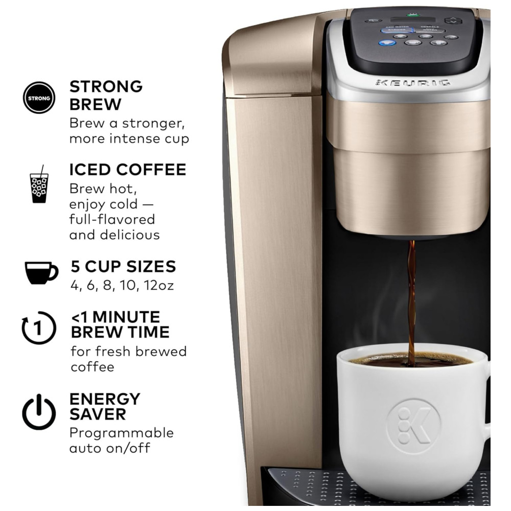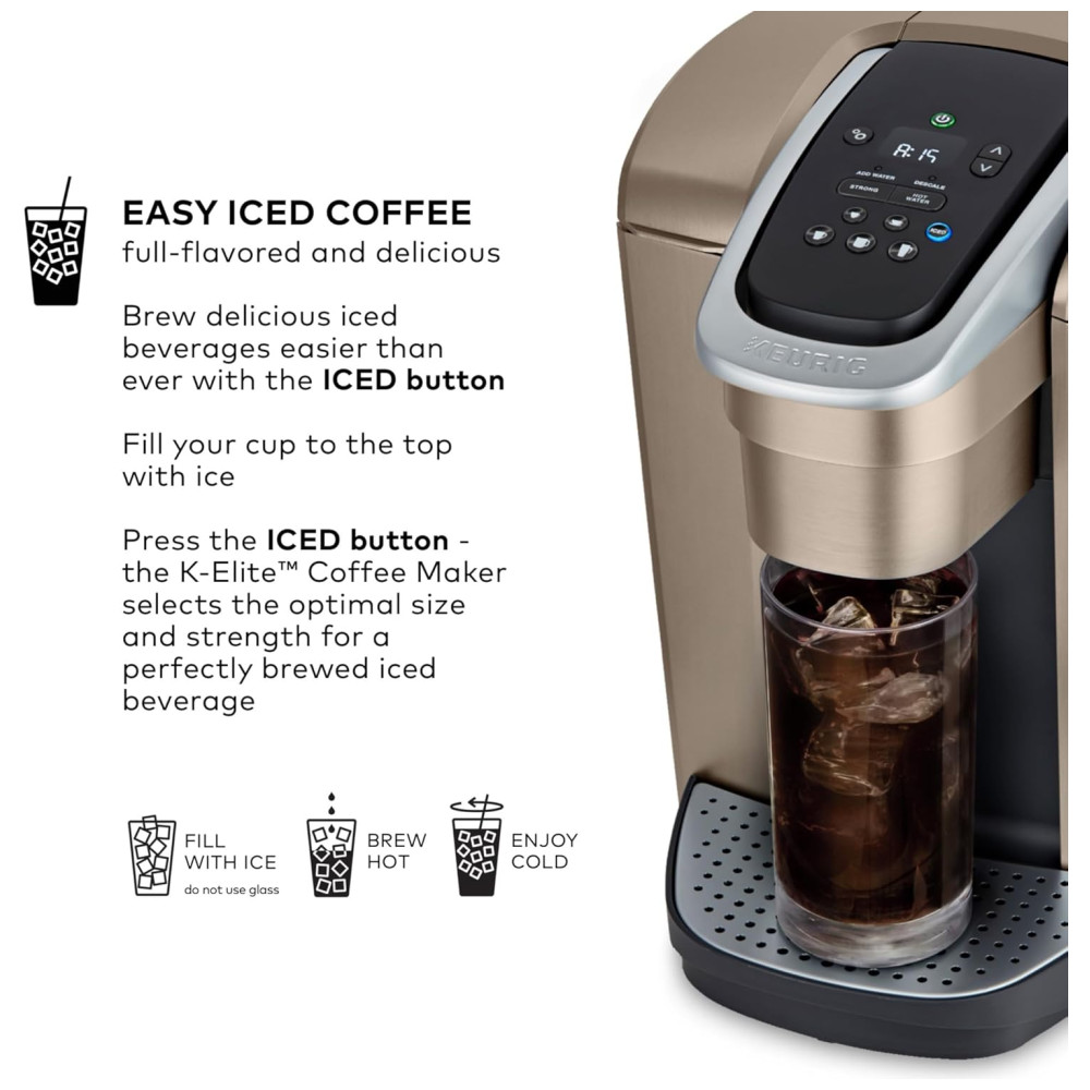 Cor Dourado. A cervejaria Keurig K Elite combina um acabamento premium e recursos programáveis para oferecer design moderno e o máximo em personalização de bebidas. Com um acabamento escovado impressionante e detalhes de metal, é uma adição elegante a qualquer cozinha. A cafeteira Keurig K Elite serve Strong Brew para quando você deseja preparar uma xícara de café mais ousada e um botão Iced para fazer quente sobre gelo para um café gelado refrescante e saboroso. Possui cinco tamanhos de café, para que você possa preparar seu café, chá, chocolate quente ou bebida gelada favorita com o toque de um botão. Escolha entre centenas de deliciosas variedades de cápsulas K Cup ou prepare seu próprio café moído usando o filtro de café reutilizável Universal My K Cup vendido separadamente. A cervejaria K Elite oferece recursos programáveis como controle automático de temperatura e temperatura, além de fornecer água quente sob demanda para sopas instantâneas e aveia, e o grande reservatório de água removível de 2 Litros permite preparar 8 xícaras entre as recargas