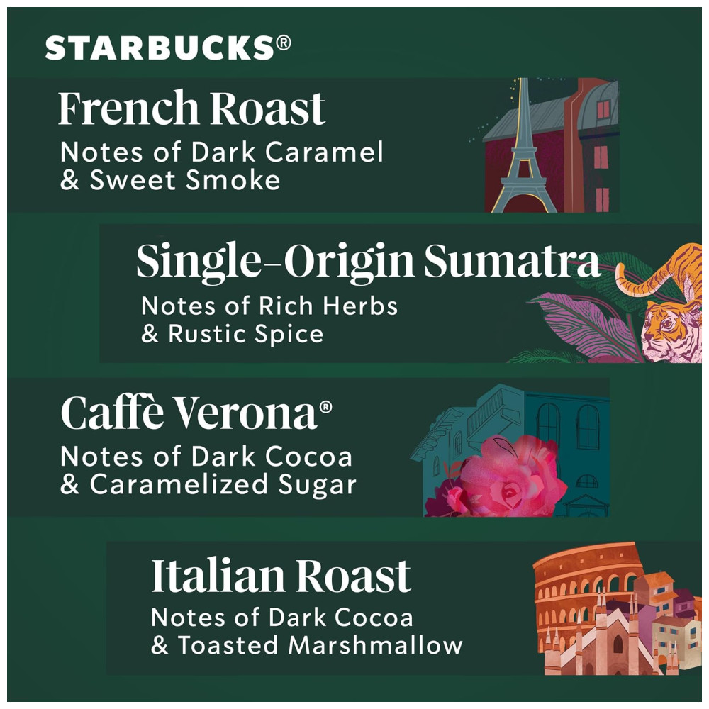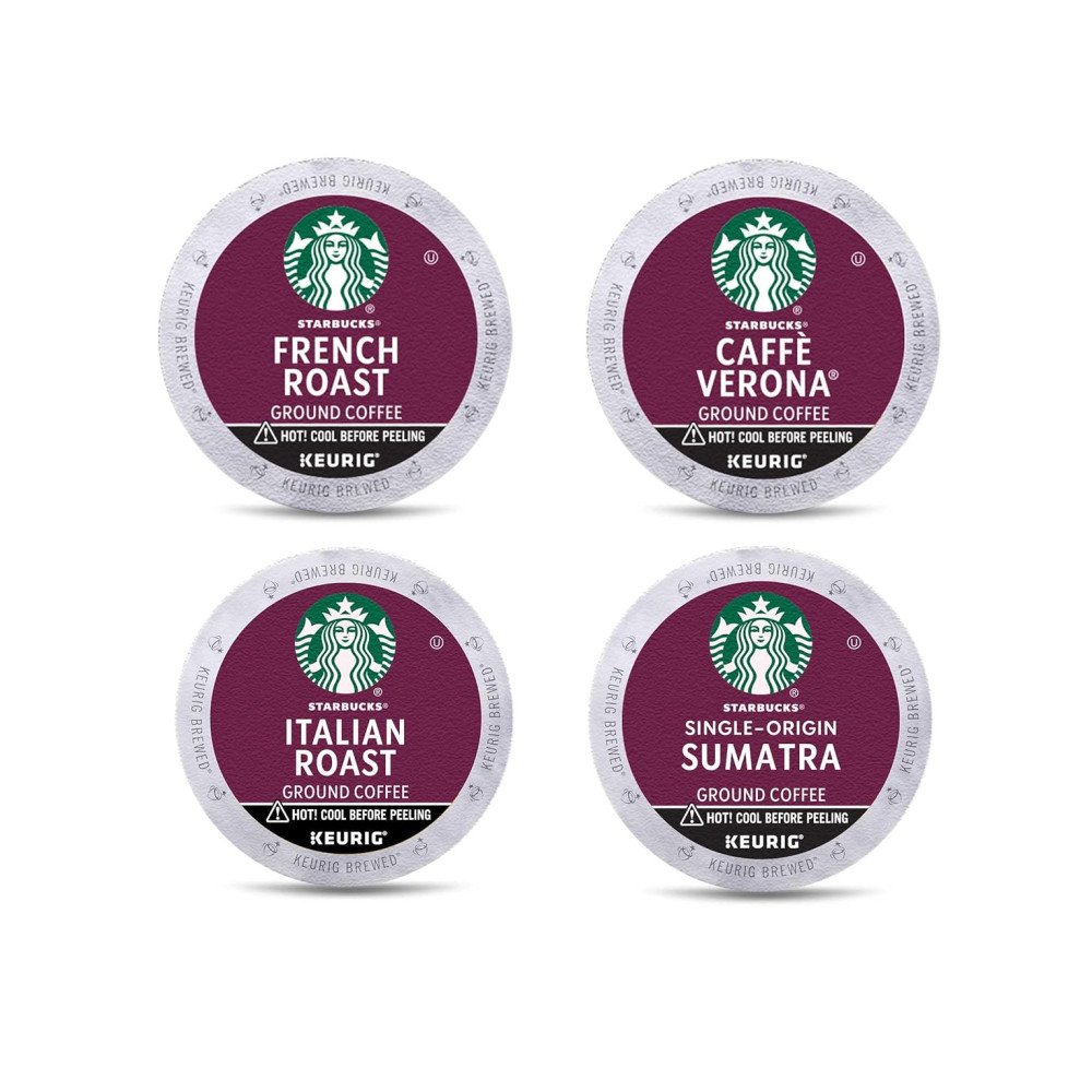 Nome do Sabor Variedade Escura Tamanho 96 unidades Explore quatro dos nossos cafés mais populares a torra francesa é intenso e com fumaça, a torra italiana é torrada e doce, o Caffè Verona é doce torrado com cacau escuro e Sumatra é picante com um aroma profundo e terroso. O Starbucks Dark Roast Coffee Variety Pack permite encontrar uma mistura que se adapte ao seu humor e paladar. Keurig e K Cup são marcas comerciais da Keurig Green Mountain, usadas com permissão