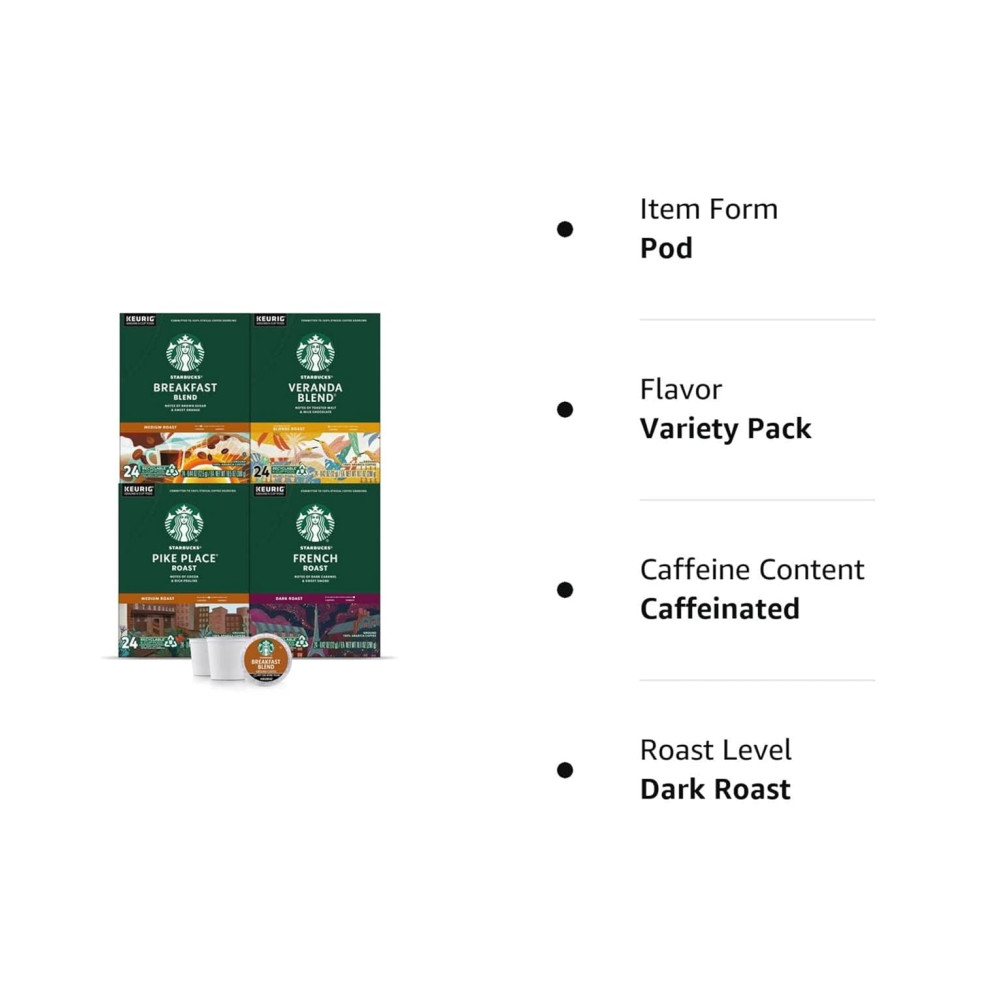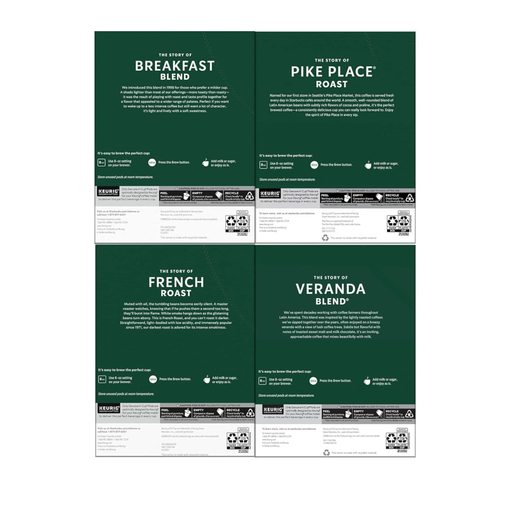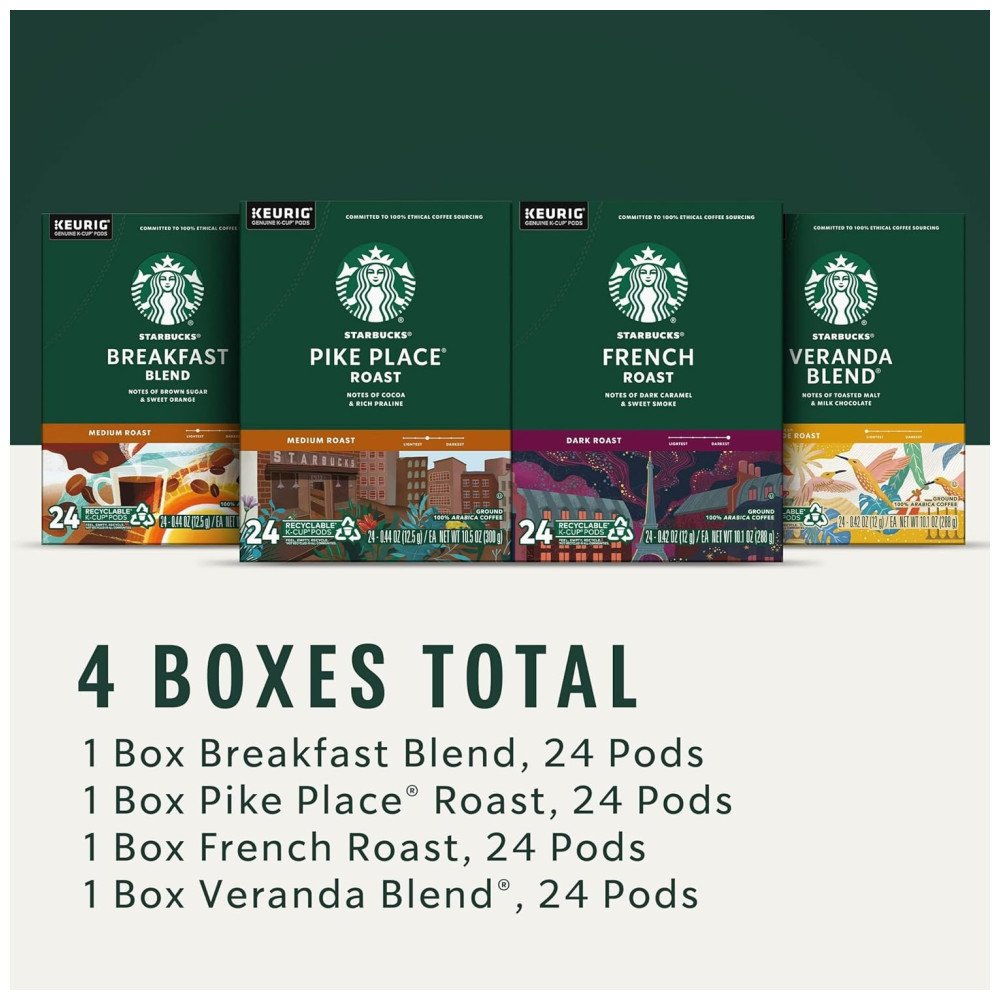 Nome do Sabor Variedade Tamanho 96 unidades Explore quatro dos nossos cafés mais populares o French Roast é intenso e com fumaça, o Pike Place Roast é suave e equilibrado, o Breakfast Blend é brilhante e suave e o Veranda Blend é suave e macio. O Starbucks Black Coffee Variety Pack permite encontrar uma torra que se adapte ao seu humor e paladar. Pike Place é uma marca registrada do The Pike Place Market PDA, usada sob licença. Keurig e K Cup são marcas comerciais da Keurig Green Mountain, Inc., usadas com permissão