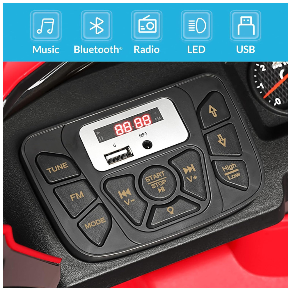 Multimídia atraente Kidzone ride on possui Bluetooth MP3, porta USB, entrada AUX, rádio FM, faróis de LED brilhantes, som de inicialização para oferecer mais diversão ao dirigir. O compartimento de zenamento traseiro vai deliciar seus filhos ao carregar brinquedos, bonecas, lanches e algumas coisas pequenas. O display de energia o lembra de carregá lo a tempo.