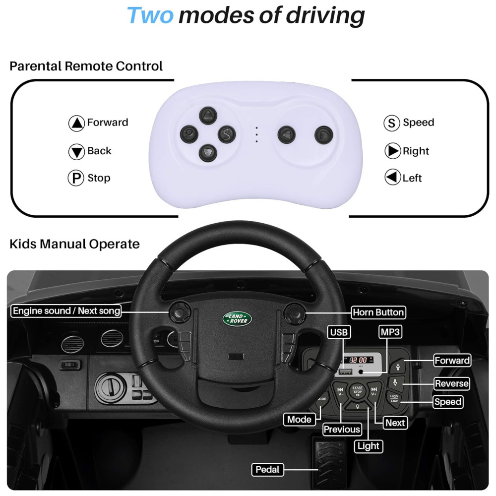 Com um botão de ligar e desligar e opções de alta e baixa velocidade, o passeio em SUV tende a ser facilmente operado por crianças. Os pais podem usar o controle remoto 2.4G para controlar a velocidade 3 velocidades variáveis, virar à esquerda , direita, avançar , recuar e parar quando seus filhos forem muito pequenos.