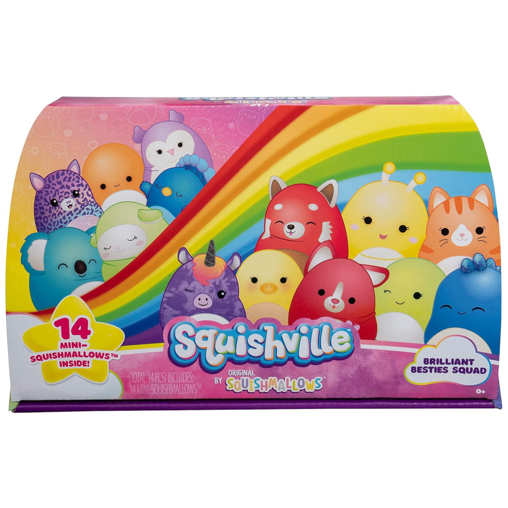 O Multipack Squishvilles MiniSquishmallows Brilliant Besties é um conjunto de pelúcias incrivelmente macias e coloridas que apresenta seus personagens de pelúcia favoritos em um tamanho mini de 2 polegadas. Com um total de 12 personagens de pelúcia MiniSquishmallows, o conjunto inclui personagens representando todas as cores do arco íris, como Cici, o Panda Vermelho, Holly, a Coruja Roxa, e muitos outros.