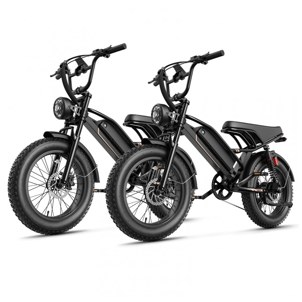 O kit Jasion YR20 Obsidian Black+Obsidian Black é composto por 2 bicicletas elétricas estilo dirt/moped para adultos, cada uma com pneus 20×4, quadro em aço carbono e motor traseiro com 1000W de potência nominal e até 3000W de potência de pico, indicadas para trilhas leves, estradas e uso off-road. A bateria de íons de lítio de 48V 20Ah, com 960Wh de energia, é removível e recarregável, oferecendo autonomia que pode chegar a aproximadamente 80 km em modo de assistência ao pedal, variando conforme o nível de assistência selecionado, o terreno e o peso do usuário.