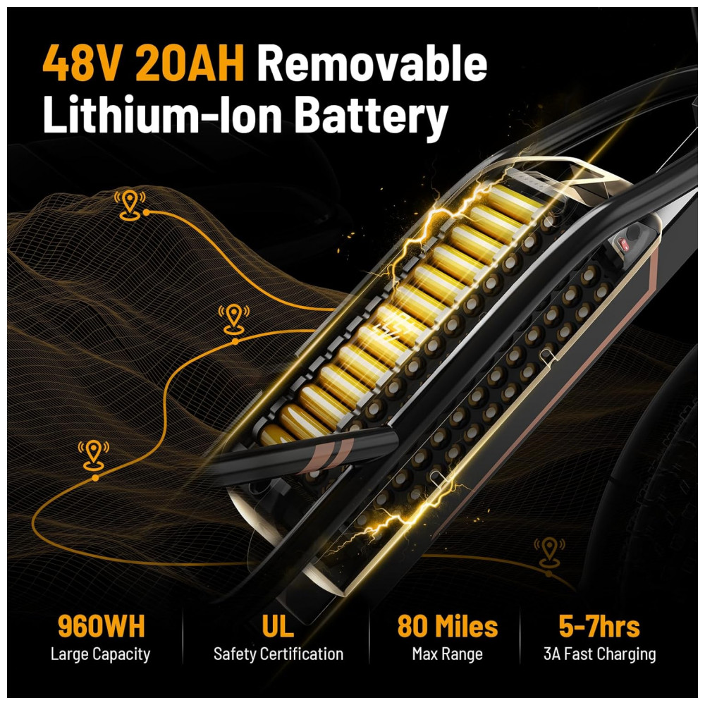 Cada bicicleta conta com sistema de assistência elétrica com modos de pedal assistido, acelerador e modo totalmente elétrico, em conjunto com transmissão de 7 marchas, permitindo adequar a entrega de potência e a cadência de pedal a diferentes tipos de percurso. A suspensão dupla, formada por garfo dianteiro e amortecimento traseiro, trabalha em conjunto com os pneus 20×4 para absorver impactos em pisos irregulares, favorecendo conforto e controle em uso urbano e em trilhas.