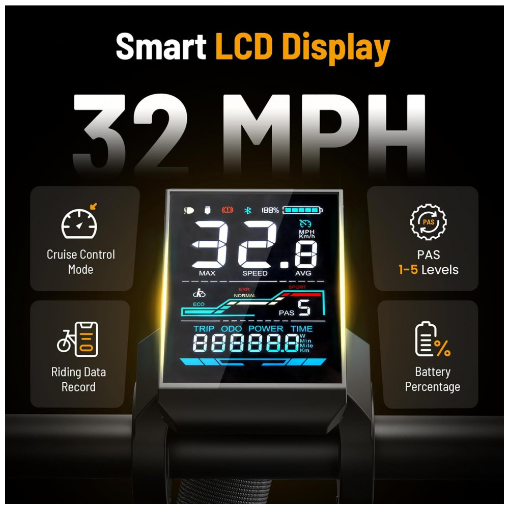 Os freios a disco hidráulicos dianteiro e traseiro atuam na frenagem em diferentes condições climáticas e de velocidade. O display LCD apresenta informações como velocidade, nível de bateria, modo de assistência e distância percorrida, enquanto o conjunto de iluminação e refletores aumenta a visibilidade em ambientes com baixa luz.