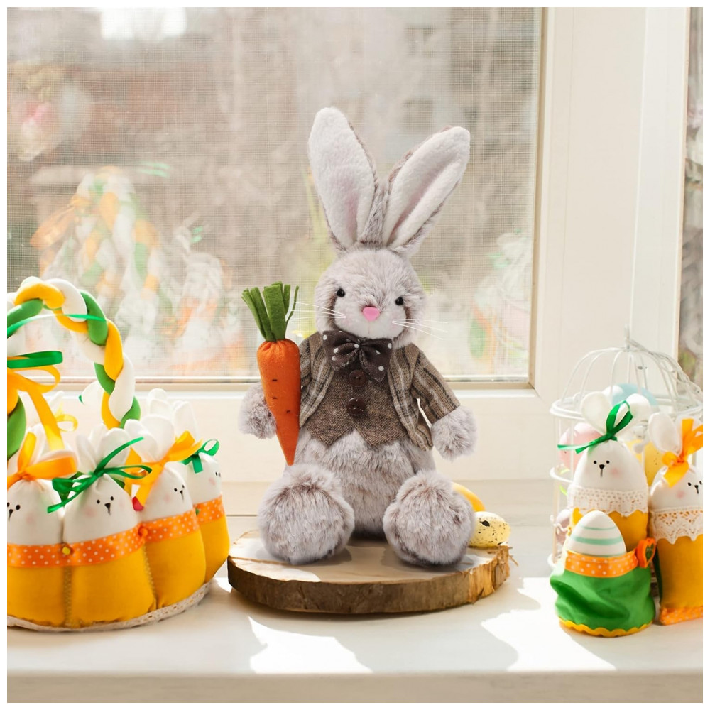 Este casal de coelhos recheados de Páscoa é uma adorável estatueta que pode ser usada como decoração para a casa durante o feriado da Páscoa, bem como em festas de primavera, casamentos, aniversários e outras ocasiões. Eles medem 32,0 cm de altura e 17 cm de largura, e são fáceis para as crianças levarem para qualquer lugar para abraços fofos e aconchegos macios. Os rostos animados desses bonecos de coelho podem atrair instantaneamente a atenção na festa infantil A graciosa Sra. coelhinha com um lindo vestido e segurando duas flores cor de rosa nas mãos, e o cavalheiresco Sr. Coelho vestindo smoking e segurando uma cenoura.