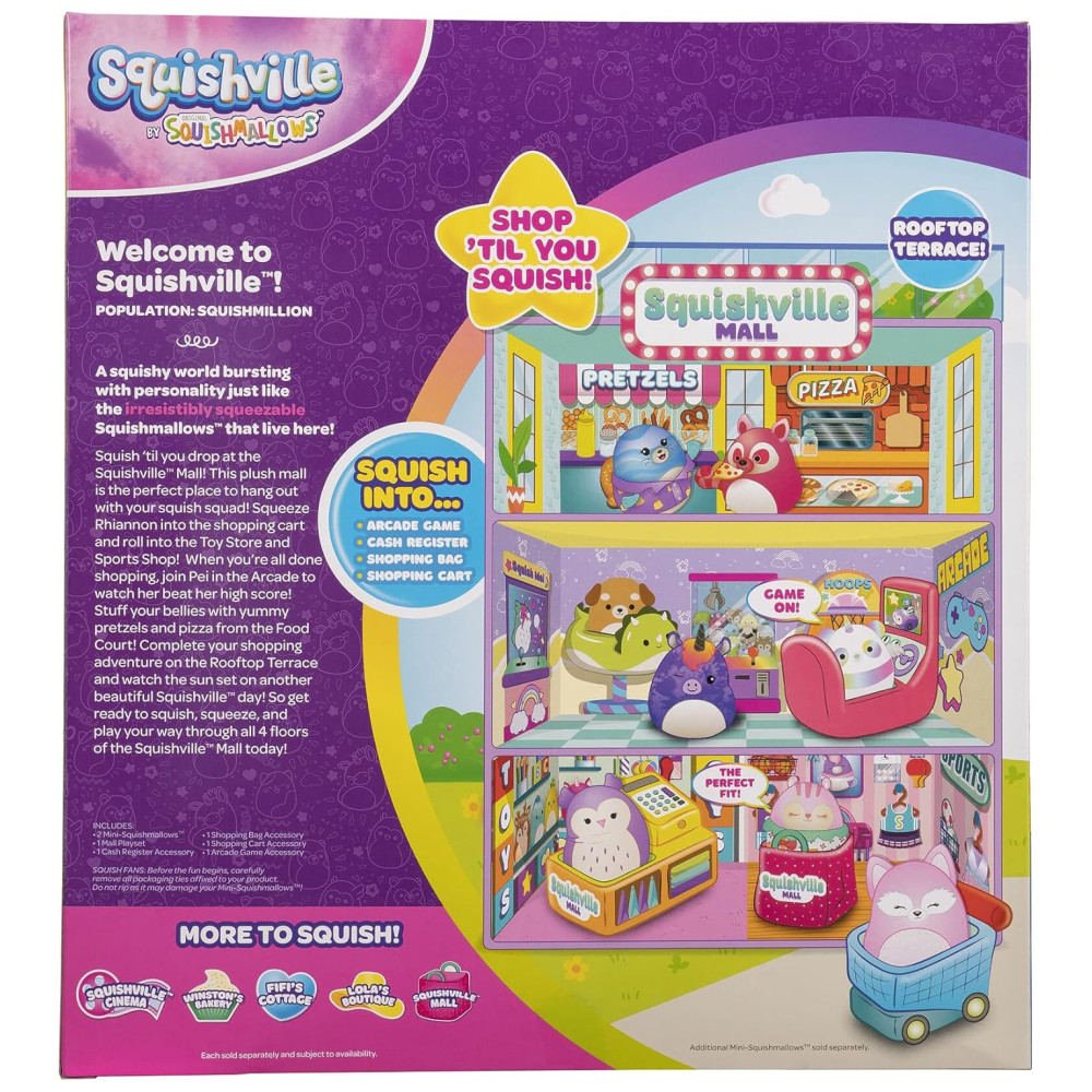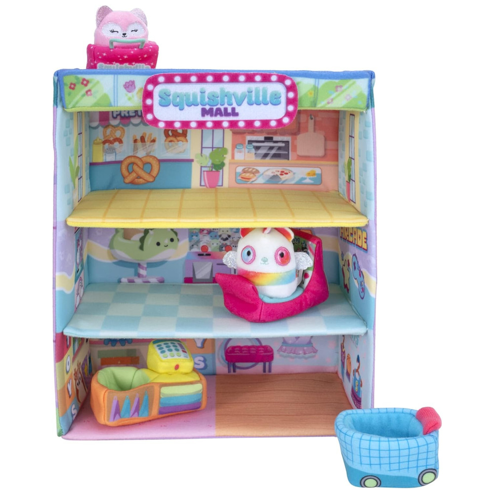 O conjunto exclusivo de shopping Squishville da Amazon é perfeito para crianças que adoram fazer compras e brincar. Acompanhado por dois MiniSquishmallows macios e eversos, Pei, o pandapegacórnio com faixas de arco íris, e Rhiannon, a raposa rosa, seu filho pode explorar várias lojas, como uma loja de brinquedos, uma loja de esportes, um fliperama, um carrinho de comida e um terraço na cobertura.
