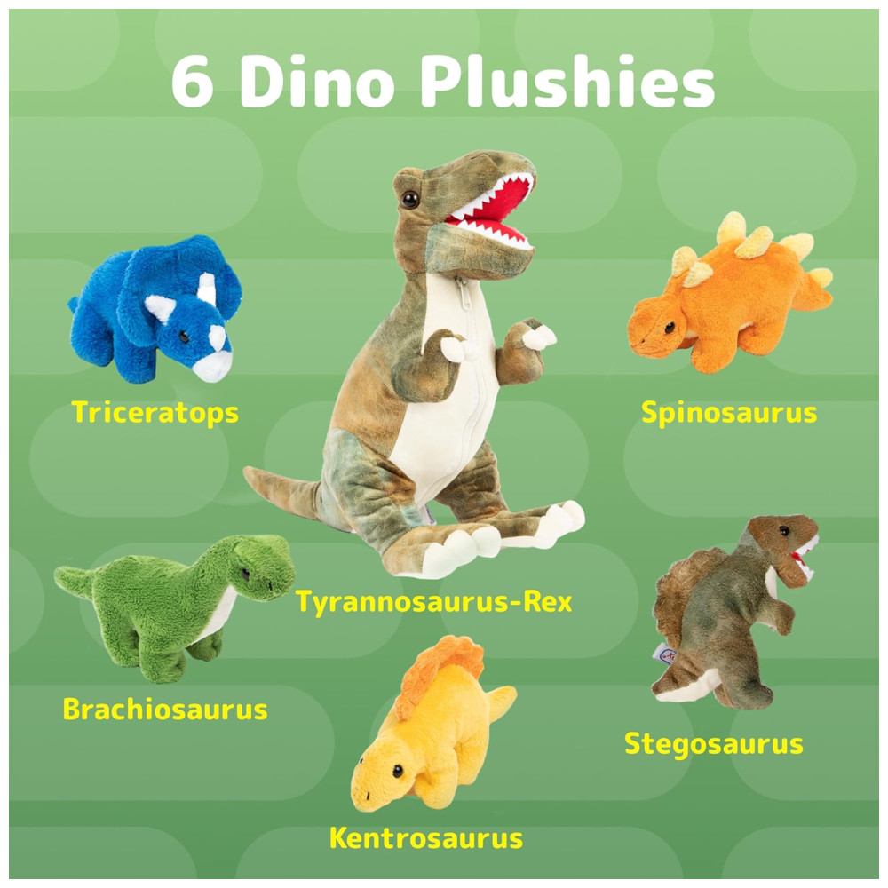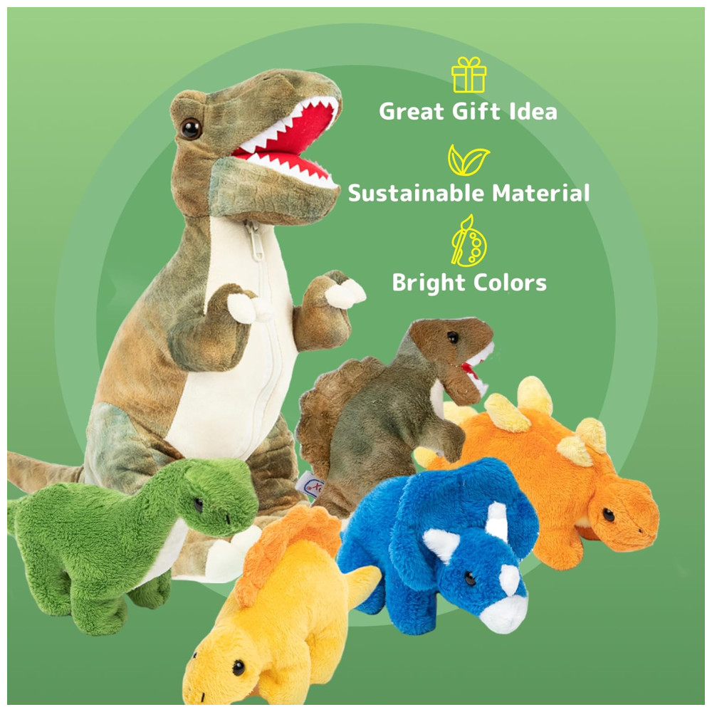 Este conjunto de brinquedos de pelúcia de dinossauro é composto por 1 dinossauro trex e 5 peluches de dinossauro de pelúcia para bebês, todos fechados com zíper dentro de um adorável porta barriga de dinossauro. Os materiais utilizados na fabricação desses bichos de pelúcia são de alta qualidade e seguros para crianças, além de serem laváveis na máquina. Com a bolsa da mãe, é possível carregar facilmente os brinquedos para viagens ou brincadeiras ao ar livre.