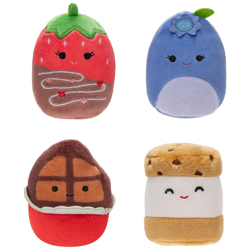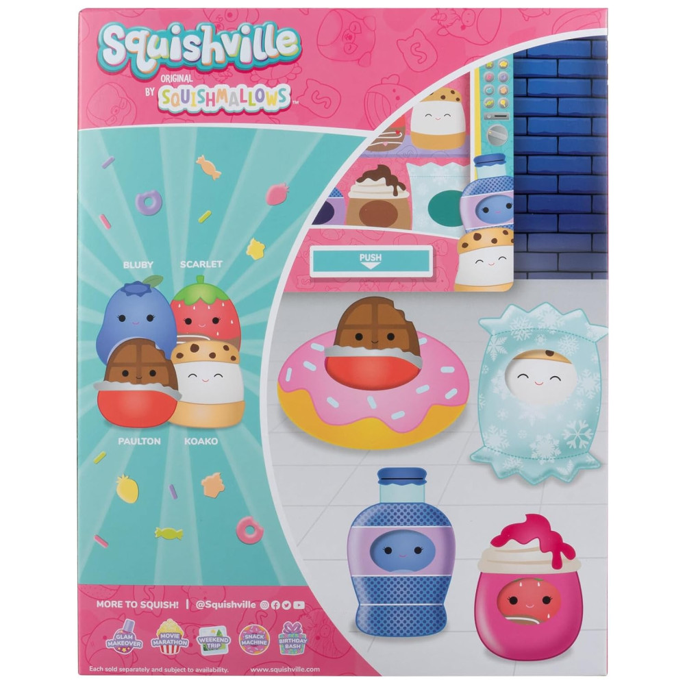 Divirta se com o pacote de acessórios para máquina de lanches Squishville O pacote inclui quatro adoráveis Squishmallows de 2 polegadas Bluby the Blueberry, Kaoko the Ice Cream Sandwich, Scarlett the Chocolate Dipped Strawberry e Paulton the Chocolate Bar. Cada um vem com uma fantasia diferente, como garrafa de refrigerante, sanduíche de sorvete, milk shake de chocolate e donut granulado, para você trocar e combinar como quiser.