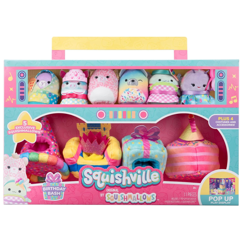 E não se esqueça de tirar fotos incríveis com o display pop up que inclui um bolo em camadas, balões e um banner para completar o tema festivo. Não perca a chance de ter uma aventura infinita com o Mundo de Squishville e celebre seu aniversário de forma única e especial