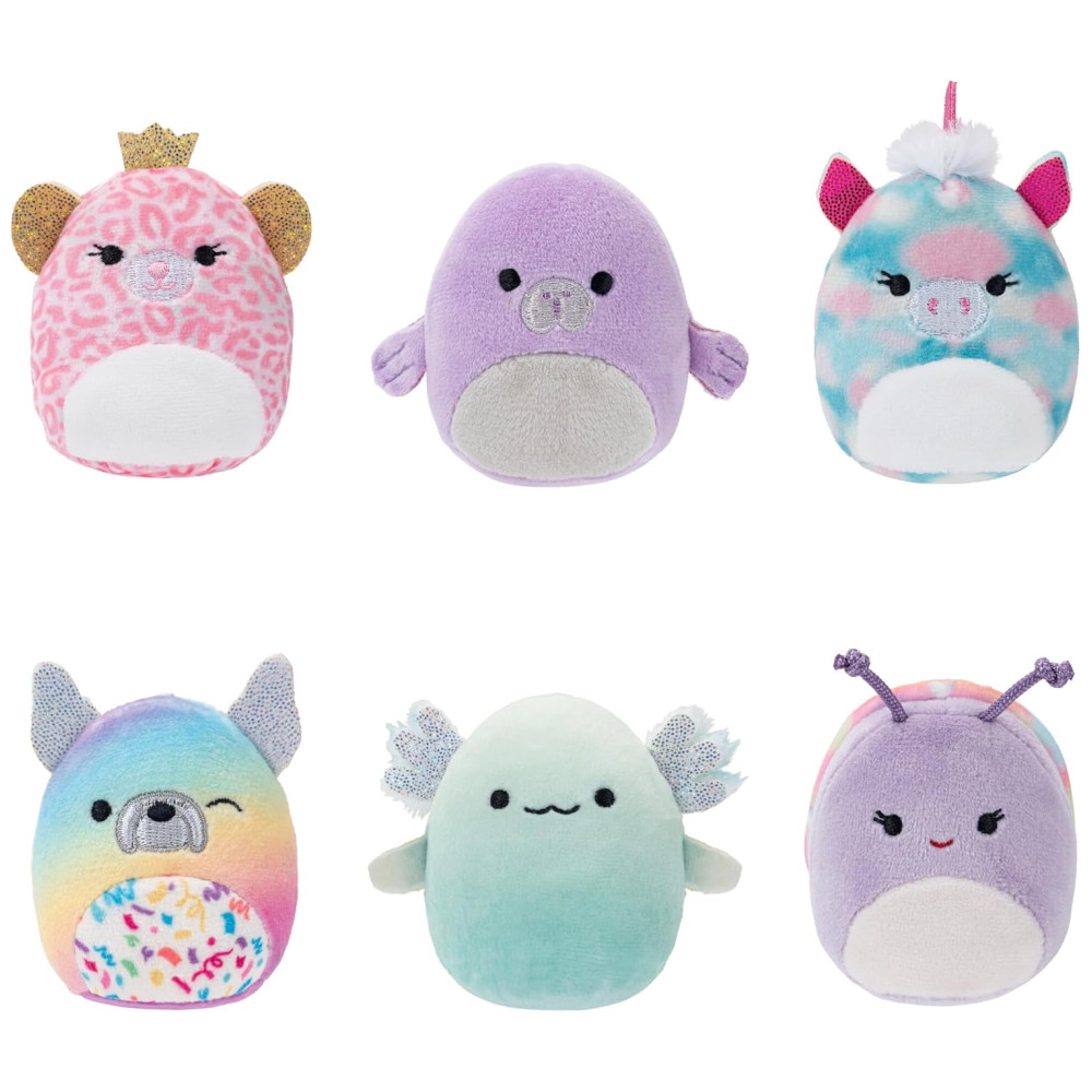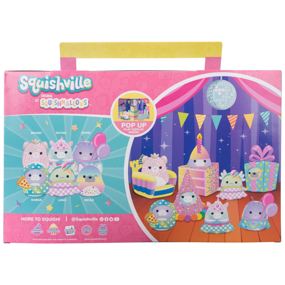 Celebre seu aniversário de forma inesquecível com os Squishmallows de 5 cm do Mundo de Squishville Marius, o peixe boi, Ruthie, o unicórnio, Lomo, o Axolotl, Swerl, o caracol, Bryar, o buldogue francês e Brandi, a fada da chita estão prontos para comemorar com você vestidos com roupas de festa sofisticadas.