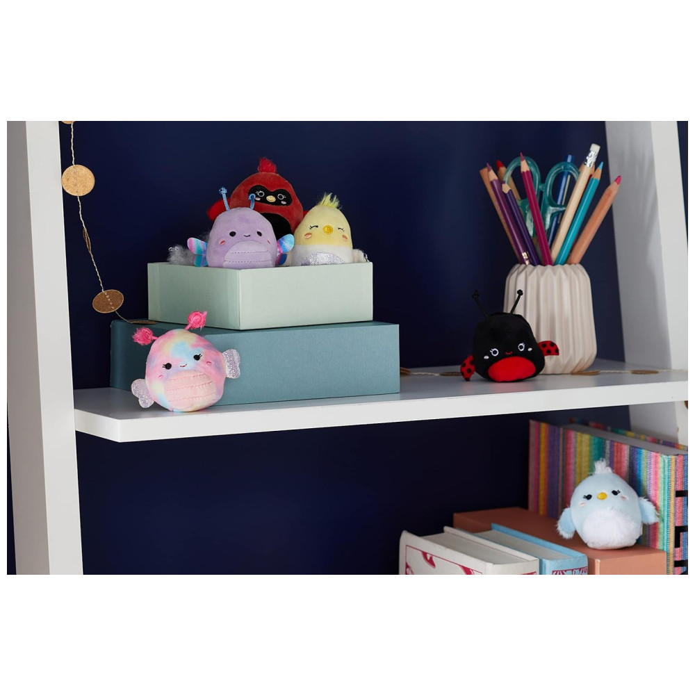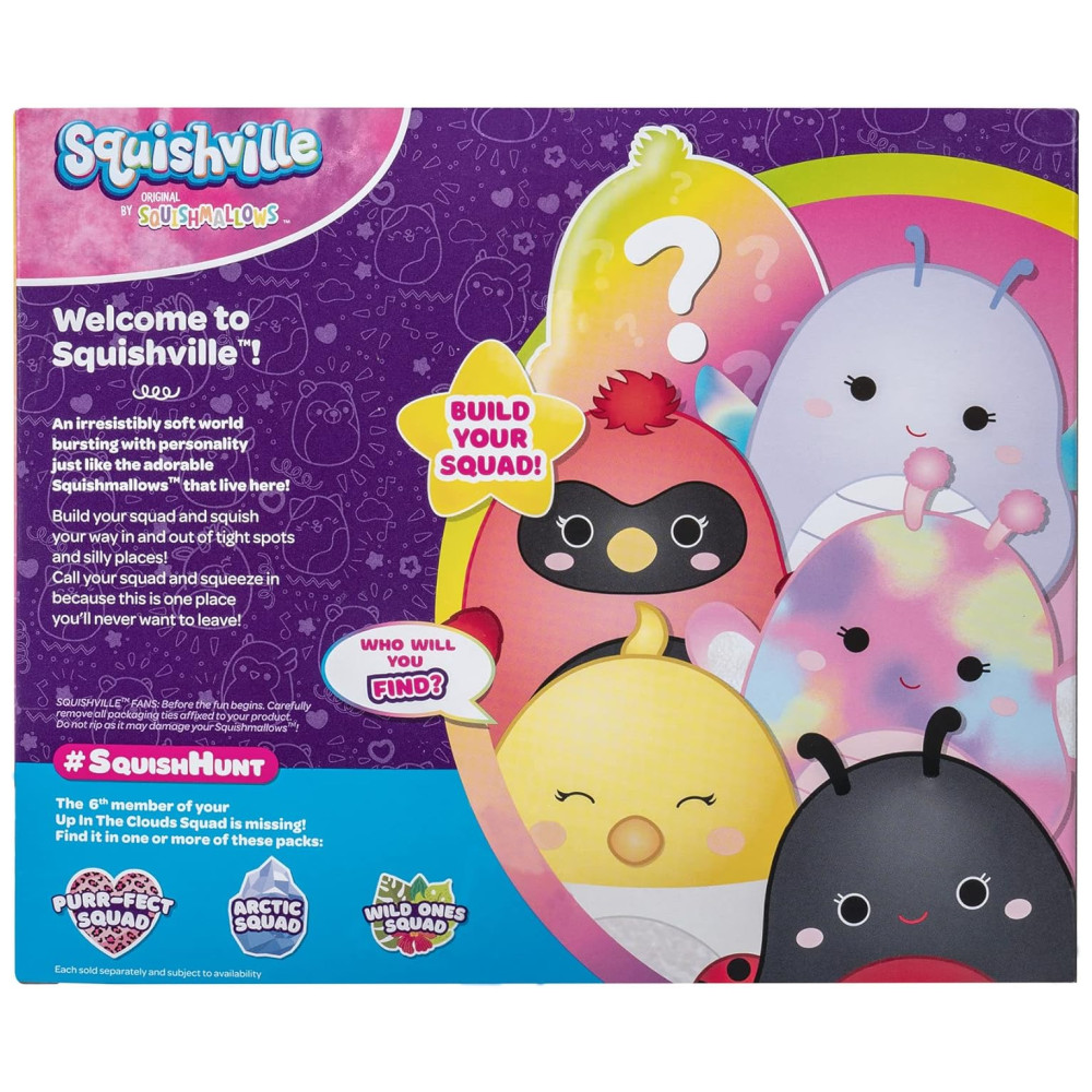 O conjunto inclui Trudy, a joaninha, Iris, a borboleta, Cazlan, o cardeal, Charlize, a calopsita e Devorah, a libélula, além de um Squishmallow surpresa. Todos são feitos com recheio super macio e têm personalidades únicas.