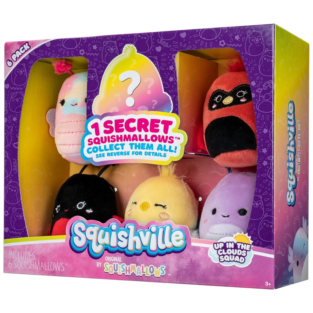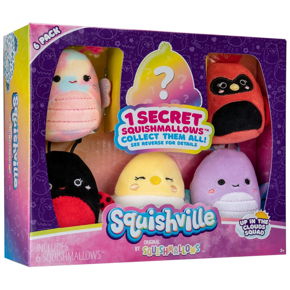O pacote Up In The Clouds Squad 6 inclui alguns dos seus Squishmallows favoritos em um tamanho exclusivo de 5 cm.