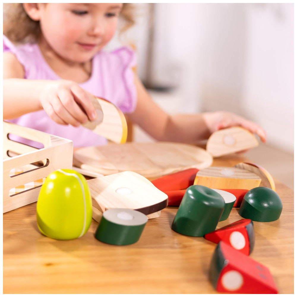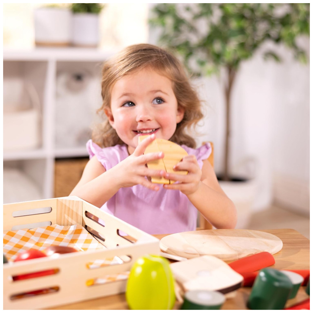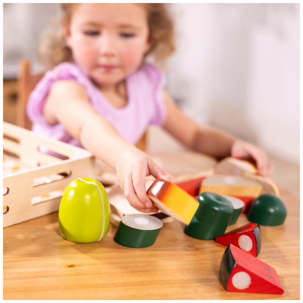 O conjunto de corte de alimentos apresenta abas auto aderentes que mantêm as peças juntas e é ótimo para brincadeiras de faz de conta e para introduzir os conceitos de parte e todo. As peças são lindamente pintadas com detalhes realistas e a construção robusta em madeira permite que o conjunto resista ao uso frequente.