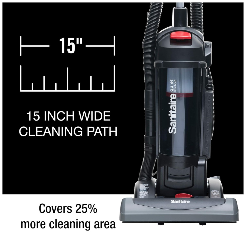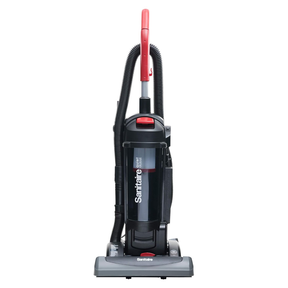 O aspirador vertical Sanitaire Force SC5845D é uma excelente opção para limpeza. Com 15 caminhos de limpeza, ele foi certificado com o Selo de Aprovação CRI Bronze, garantindo uma limpeza excepcional. Além disso, conta com um filtro HEPA lavável, que garante emissões mais limpas. Ideal para limpeza diurna, possui baixo nível sonoro e ferramentas integradas, incluindo uma mangueira extensível para limpeza acima do piso. Já o aspirador vertical sem saco Sanitaire Professional SL4410A é uma opção mais acessível, mas igualmente eficiente. Com ferramentas integradas para limpeza acima do piso, possui um caminho de limpeza de 33 cm e um copo de sujeira removível de 0,93 litros, eliminando a necessidade de sacos de vácuo. O cabo de alimentação de nível de 9,12 metros permite cobrir uma área potencial de limpeza de 435 m². Ambos os aspiradores são ótimas escolhas para manter seu negócio limpo e organizado.