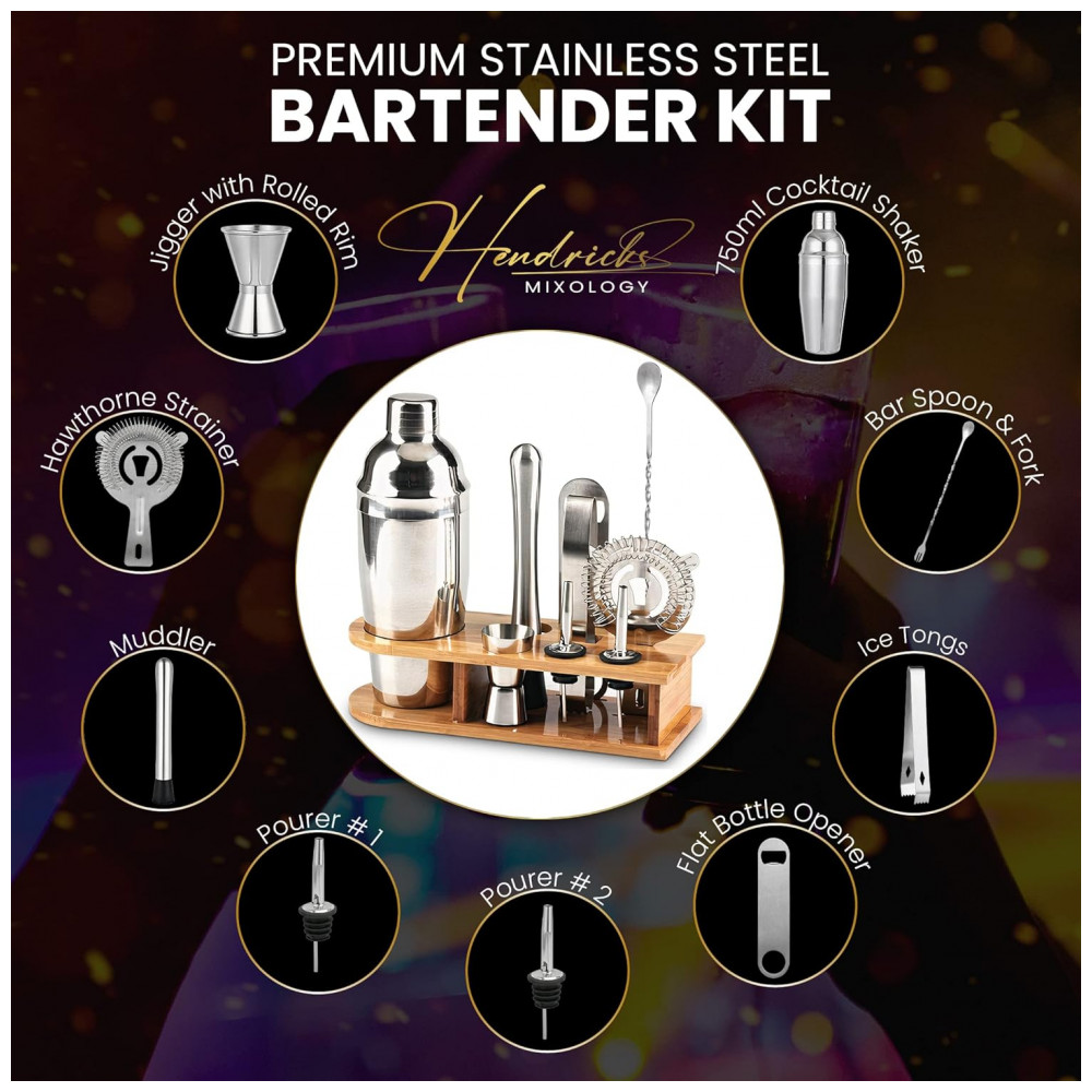Kit Premium Mixology Bartender O conjunto de misturadores de coquetéis inclui um elegante agitador de coquetel de 750 ml, um coador para o derramamento perfeito sempre, um abridor de garrafas plano fácil de usar, uma elegante colher de bar de dupla face e um garfo agitador, um jigger de aro enrolado para medições precisas, 2 despejadores de álcool, pinças de gelo, um macerador para triturar e um suporte de madeira personalizado. Com Hendricks Mixology, você não precisará comprar cada ferramenta separadamente, tornando a uma solução econômica para configurar sua própria barra de casa.